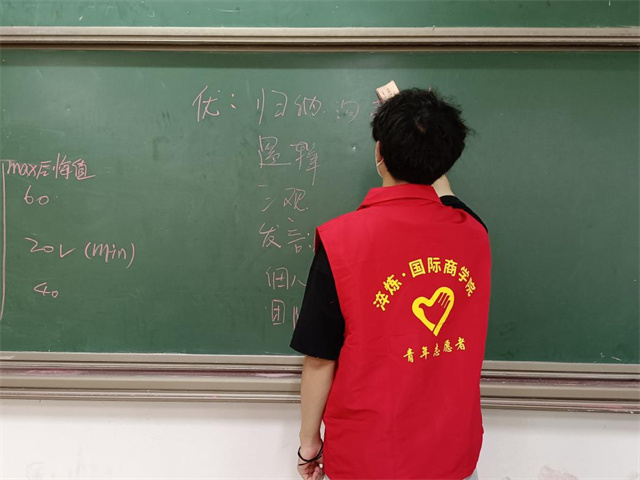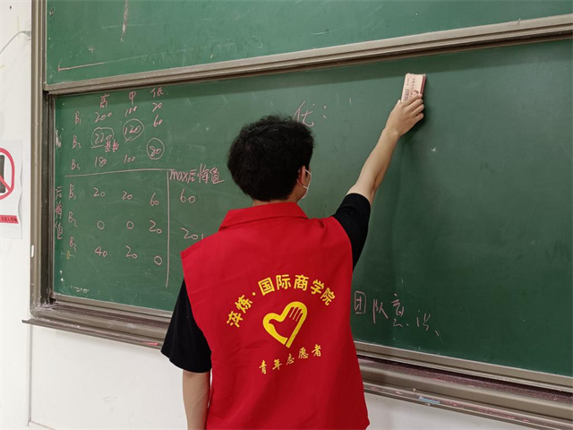 与此同时,活动期间,淬炼青协的志愿者们也做起了劳动,他们在同学们下课后将黑板擦拭干净,把饮用水搬到无人售卖处,方便同学们在炎炎夏日能够喝到水。