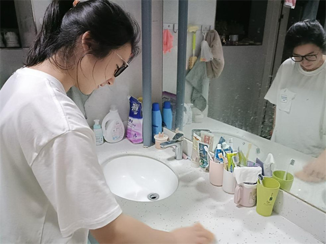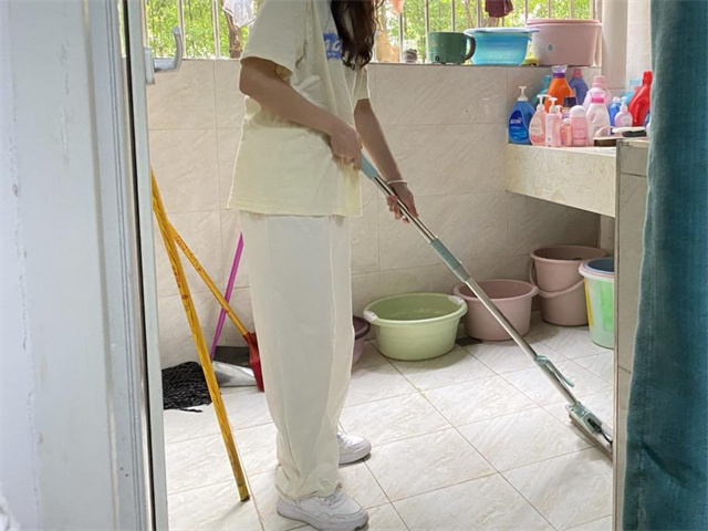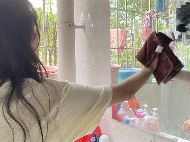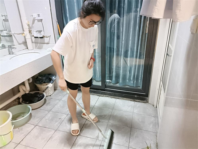 没有回家的同学则在寝室做起了劳动——“寝室大变样”。他们拿起扫把,抄起簸箕,各种灰尘统统被扫光,用抹布将玻璃瓷砖擦的亮丽,让拖把脏东西统统带走,寝室变得干净明亮。