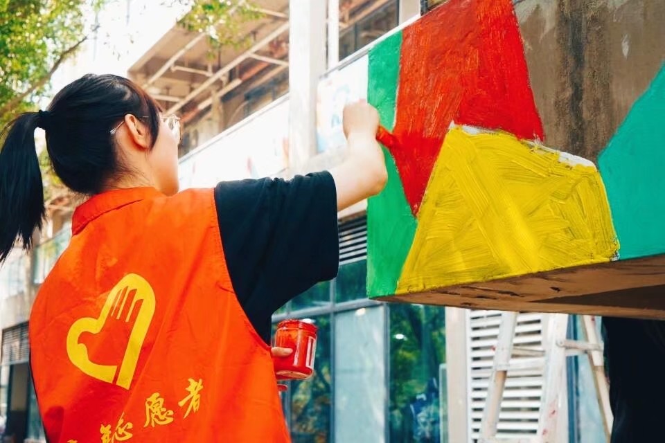 志愿者们调制画盘中的颜料,挥舞着手中的笔墨,仔细地勾画着墙面每一个轮廓,志愿者们用这种方式传递积极向上的思想、表达热烈活泼的情感,全身心投入到美化校园之中。炎炎夏日,志愿者们头顶着骄阳,挥洒着汗水,用手中的画笔勾勒出一幅幅生动活泼、精彩夺目的墙体画,得到了周围路过同学们的一致称赞。