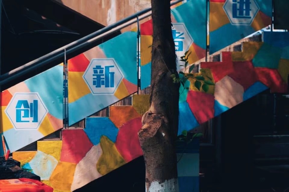 墙绘开始前,艺传志愿者们和汇江书院的指导老师进行交涉沟通,对要作画与展现书院主题地区域进行商议确定。首先是对汇江书院的主要楼梯进行涂鸦彩绘,对楼梯的设计想法是绘出类似“七巧板”的模样,与汇江书院楼梯上的贴画相呼应。采用丙烯颜料,调制出的色彩既有五彩缤纷的既视感,又不会给人过分艳丽的感觉。期间大家们协作明确,抬水、搬运、准备工作以及轮流扶着梯子,保证高处彩绘志愿者的安全。