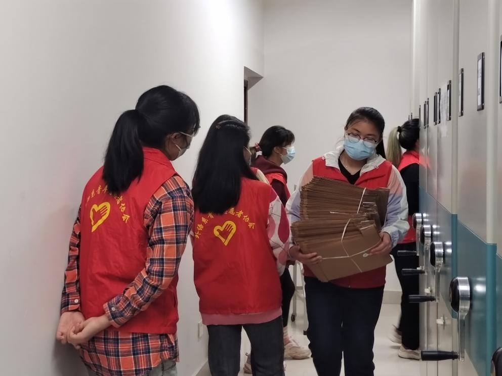 活动开始,志愿者们早已了解活动要求,整齐的排列在档案室狭小的过道里,志愿者们跟随李老师的安排,接过老师手中的档案,互相帮助,团结合作。我们活动的主要流程就是整理档案室的档案。志愿者们完成了一系列的工作,开启了下一项工作——传送档案,归档。