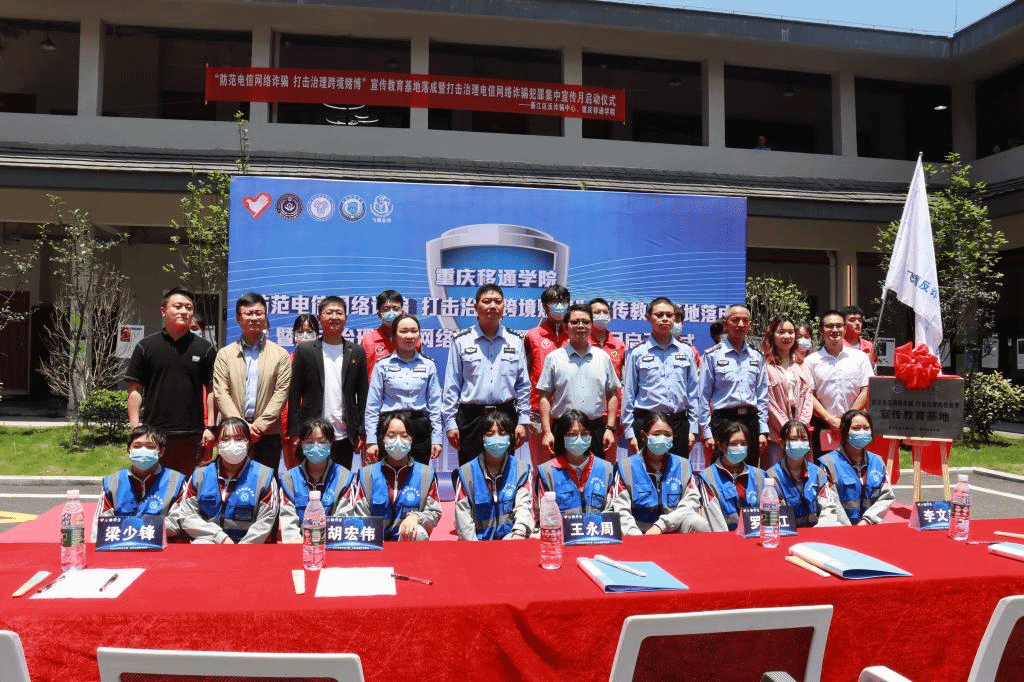2022年5月20日中午,在綦江区公安局及师生们的见证下,“飞鹰”反诈宣传志愿服务专项支队与綦江区公安局“防范电信网络诈骗,打击治理跨境赌博”宣传教育基地在重庆移通学院綦河书院内正式挂牌。