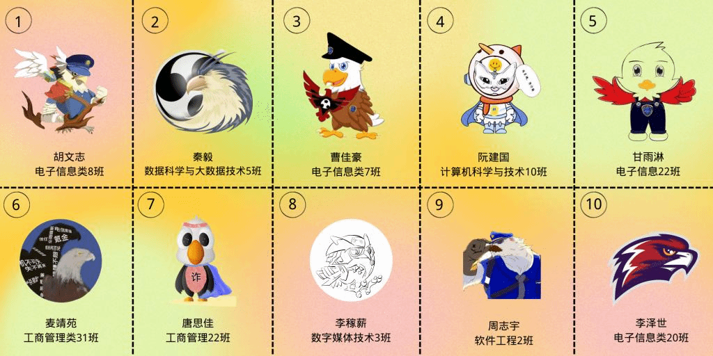 为扩大“飞鹰”反诈宣传志愿服务专项支队影响力,让同学们在遇到关于诈骗的问题时能找到解决问题的办法。2022年5月10日至5月18日,通信|信安青协在悠学派发布征集“飞鹰”支队的象征吉祥物的活动,面向全校移通学子征集反诈吉祥物。截止于5月18日,共收集作品560余份,经过重重筛选,共筛选出十份优秀作品。为将反诈意识深入每个同学的心中,通信|信安青协将筛选出的优质作品用文化墙的形式在綦河书院进行展示,吸引同学们前往观看。