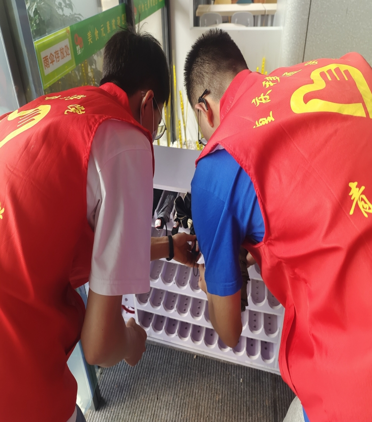 送“我”回家·失物招领志愿服务专项支队志愿者们利用拾到但长时间无人认领的雨伞,在食堂、图书馆、教学楼、宿舍楼等地摆放支架进行投放,同学们如果在紧急情况下要借用雨伞,就可以进行扫码登记,进行借用,后期在任意归还点也可以归还。当然,在雨伞流动的过程中,同学们发现摆放雨伞正是自己的,也可以持雨伞联系志愿者进行领取归还确认,做到爱心传递,失物认领两不误。