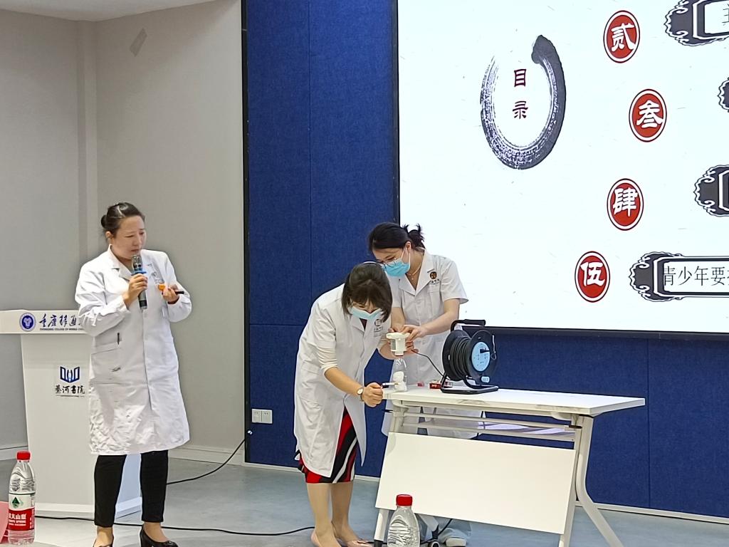 “一切推理都必须从观察与实验得来”。实验出真知,为让同学们更清晰明确的知道吸烟带来的身体危害,两位医护工作者上台,运用实验器具模拟人体吸烟。只见气体进入装有棉花的瓶子,不过短短几分钟棉花就变黄了。经过周主任的解释同学们知道,充入的气体相当于人体吸入两支烟,变黄的棉花相当于肺。两支烟的含量已将肺变黄,而人们一天的吸烟量却不只两支,日积月累肺早已从红色变为黑色,人体也早已不健康。生命只有一次,远离烟草,维护健康,周主任向同学们呼吁道。