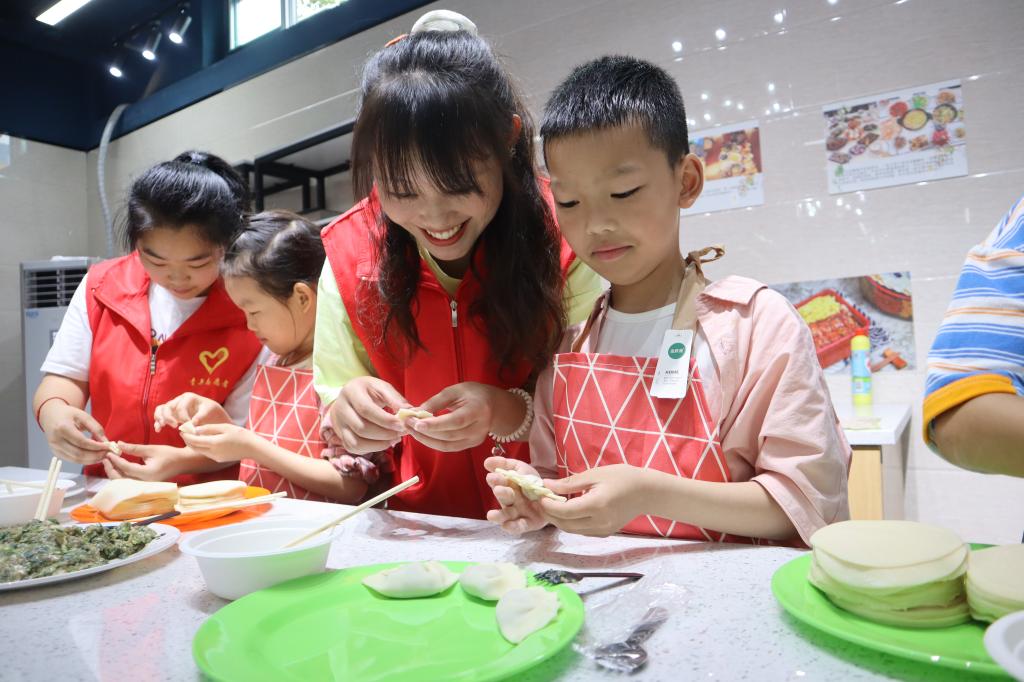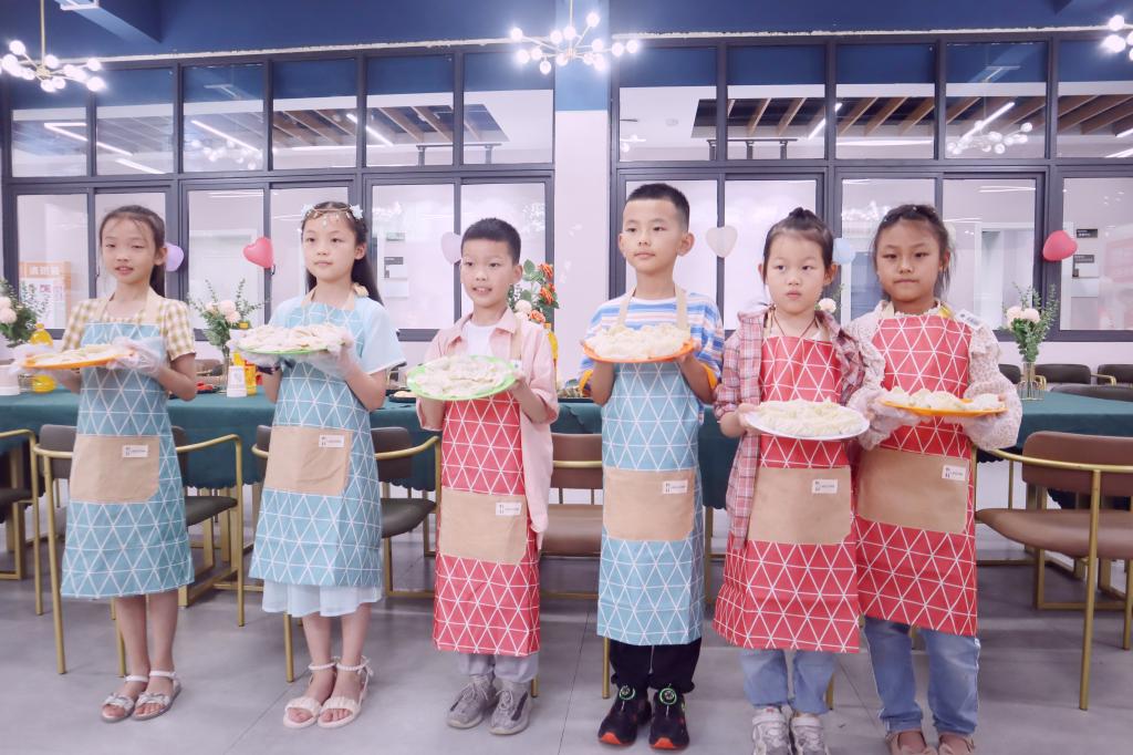 随后,在志愿者的带领下,小朋友们来到共享厨房。初次从家长手里接过烹饪的“任务”,看着眼前的饺子皮和肉馅,小朋友们都略显无措。为了更好地协助小朋友们完成今天的任务,志愿者与六名小朋友形成一对一的互助模式,保证即使是在小朋友们动作生疏的情况下,也能在志愿者的指导和协助下,做出一个个圆滚滚的饺子。在逐渐熟悉的过程中,小朋友们还发挥自己的想象力,打破传统饺子的样式,做出了各种形状的饺子。在包饺子的过程中,不仅仅锻炼了小朋友的动手能力、创新能力、更能通过实际行动践行劳动教育。