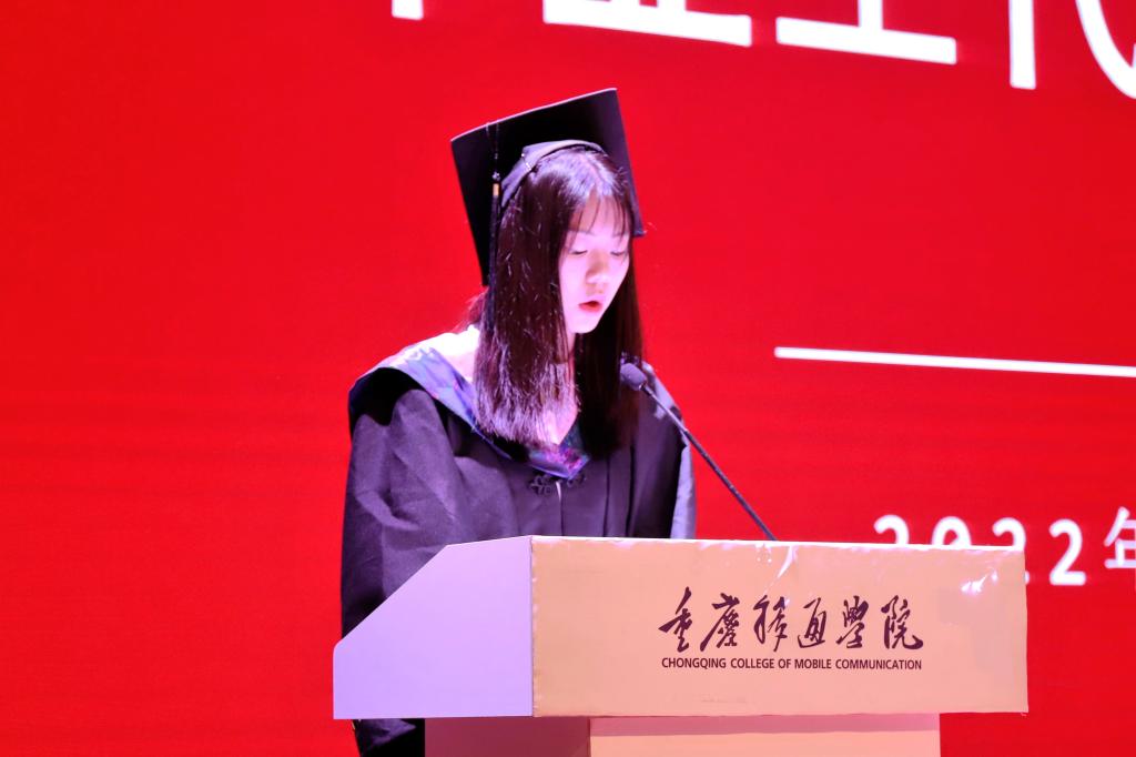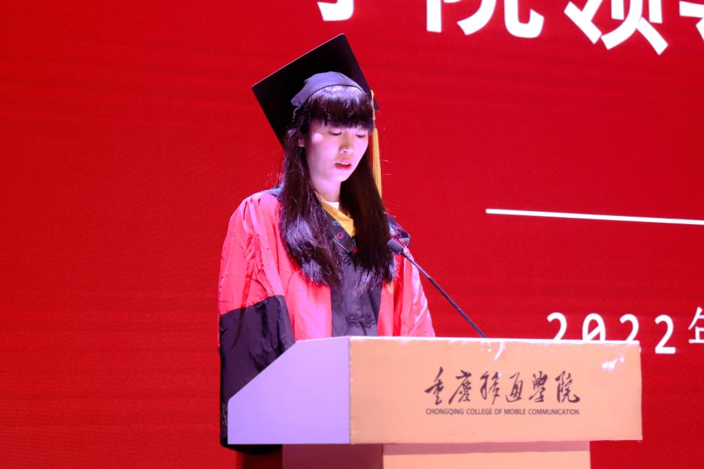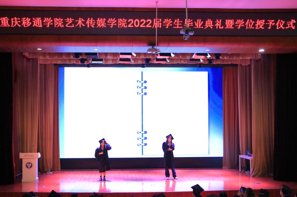 典礼进入下一项,艺术传媒学院张梅副院长宣读《重庆移通学院2022年优秀毕业生、优秀论文、优秀毕业生论文表彰的通报》优秀毕业生代表进行领奖、李轶天院长宣读学士学位授予名单的决定。学位授予仪式正式开始,各位领导、老师为本科毕业生颁发学位证书,拨穗那一瞬间,他们的脸上流露出无限的留念与感激,发在他们手里的不仅仅是一张证书,是一份沉甸甸的知识,更是一份真挚的祝福。