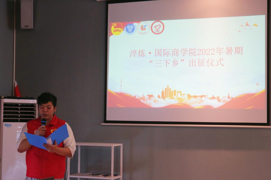 暑期“三下乡”社会实践活动是青年大学生受教育、长才干、作贡献的社会课堂,也是提升实践育人成效的切实举措。淬炼·国际商学院于2022年7月1日上午在第五教学楼商学图书馆开展了“乘风破浪潮头立,扬帆起航正当时”淬炼·国际商学院2022年暑期“三下乡”出征仪式。本次出征仪式邀请到淬炼·国际商学院学工副院长刘薇唯、团总支书记黄新燕、学工办主任廖进、各个板块指导老师及10名暑期三下乡社会实践活动志愿者参加。
