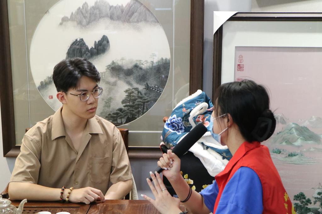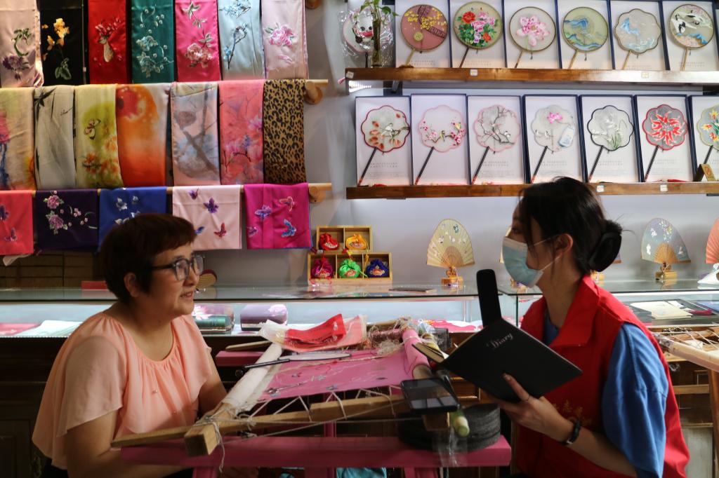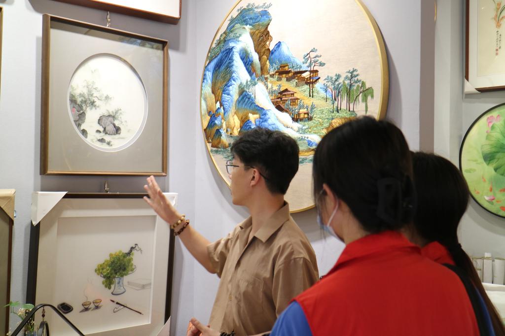 罗泽霖老师作为一名男性弟子,对于乱针绣有专属于自己独到的见解。他认为,作为一名男性弟子这不仅没有什么不好,反而能吸引旁人的兴趣,因为在传统观念里,刺绣大多都是女子的事情,而如今男子刺绣,不仅可以发展自己的爱好,还可以宣传乱针绣。志愿者参观店内成品时,小罗老师也在旁边耐心为志愿者讲解。