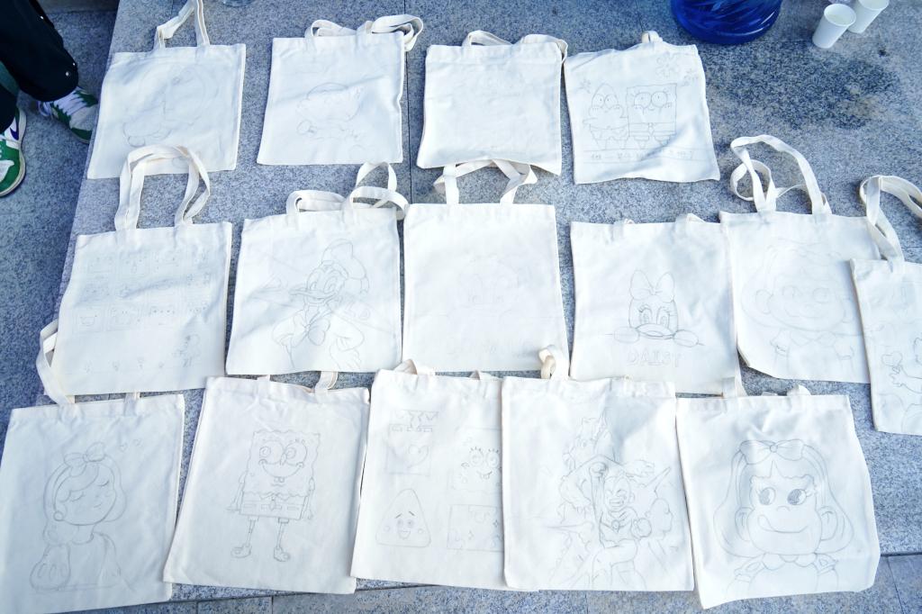 活动伊始,志愿者为小朋友讲述今日活动的意义,带领小朋友以纵队的形式前往帆布包diy地点。帆布包图案样式多样,小朋友挑选自己心仪的帆布包。志愿者开始对小朋友进行分组,分发颜料、画笔等,并强调颜料使用问题。小小的手拿着长长的画笔,略显稚拙的动作之下是一个个飞向云端的梦想。