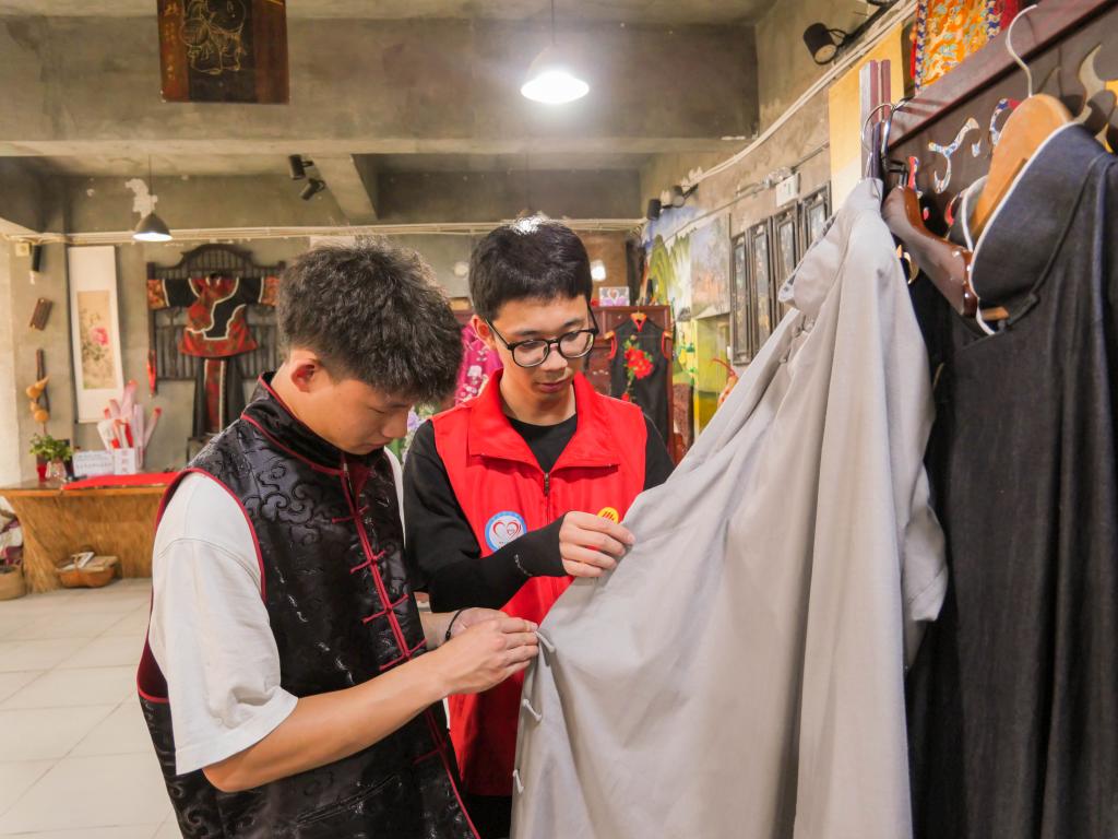 在蒋玲均、张玉梅、李绅源等老师的指导下,实践团进行了旗袍尺寸勾画、剪裁等实践操作;并且,男生穿上中式男装,女生穿着旗袍,实践团真真在在的感受了传统服饰的魅力,非遗的底蕴。