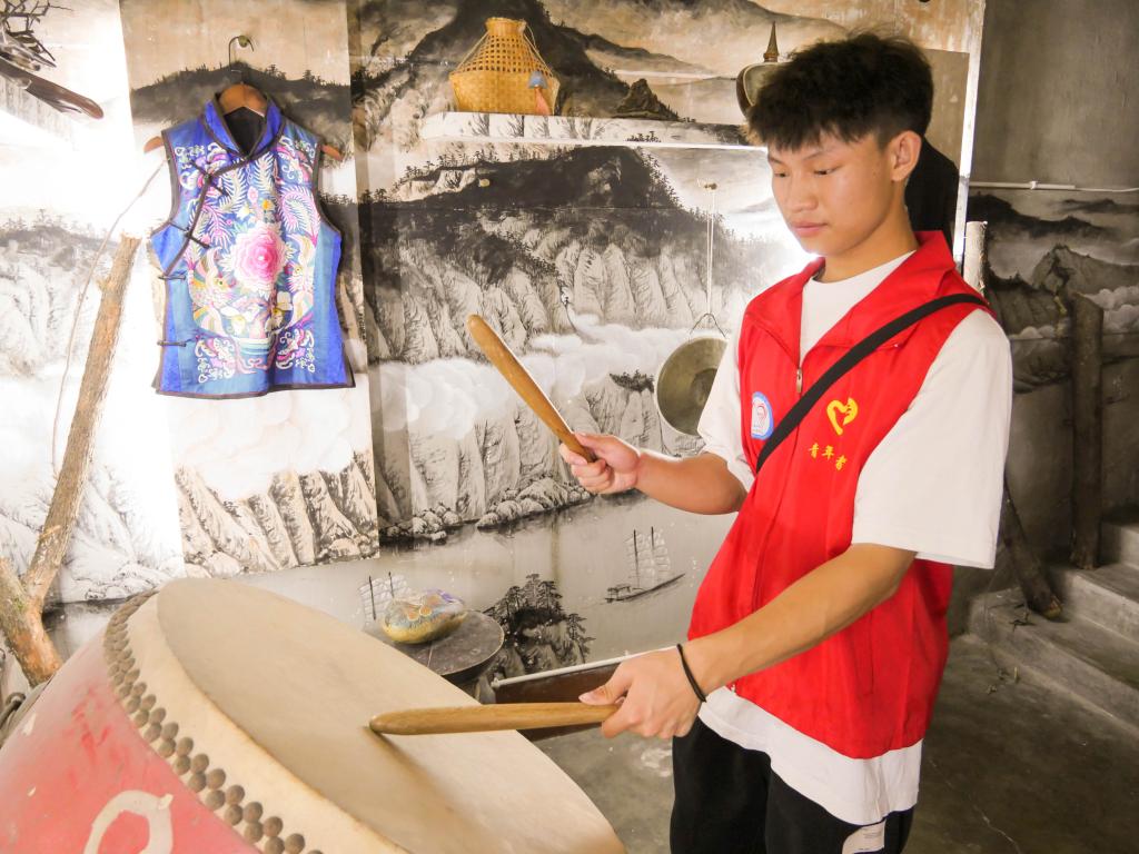 上午10:00,实践团到达君临百年旗袍博物馆,第四代传承人李绅源老师带领大家敲打店门前的锣鼓,李老师表示,敲锣打鼓是为了让门口的门神、财神听见,门神辟邪,财神招财,起美好祝福之意。进入馆内,实践团成员依次使用毛笔在红纸上签名,并落座马凳,第三代传承人蒋玲均老师向实践团介绍了桌上摆放的绒花、扎染、刺绣、竹编等非遗工艺品,同时指导实践团体验刺绣,制作专属自己的“钱多多”。