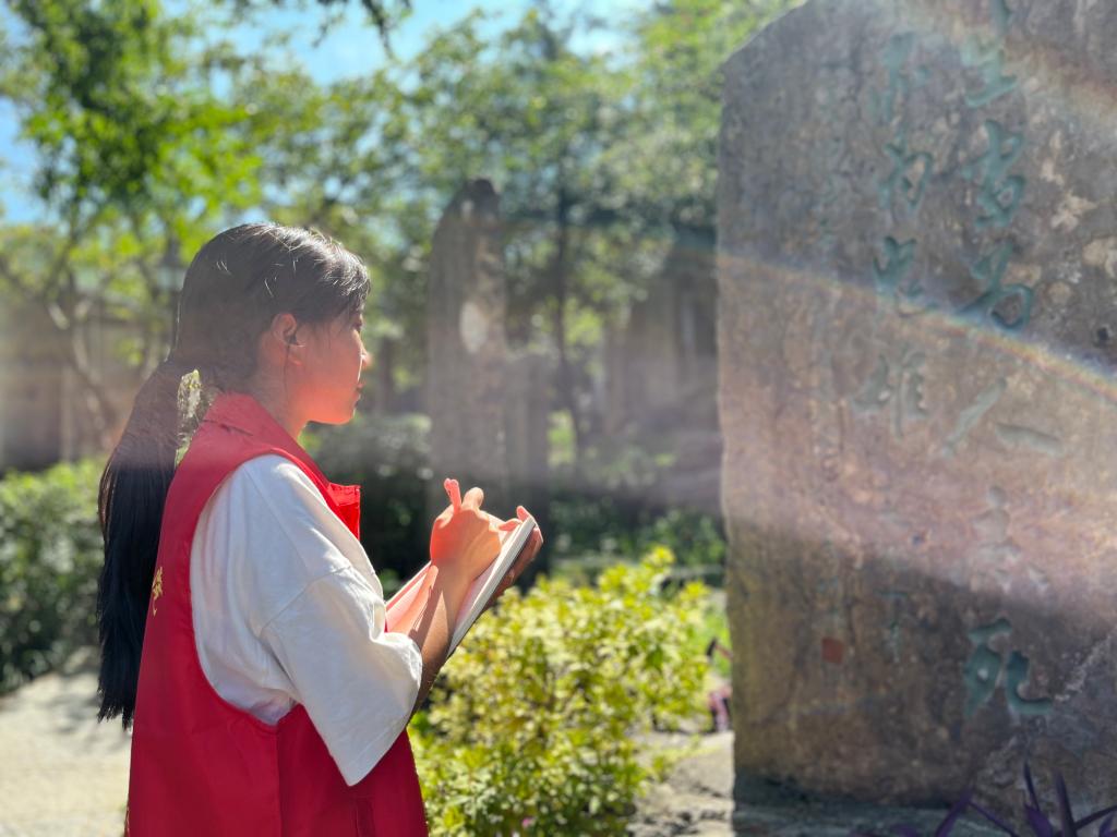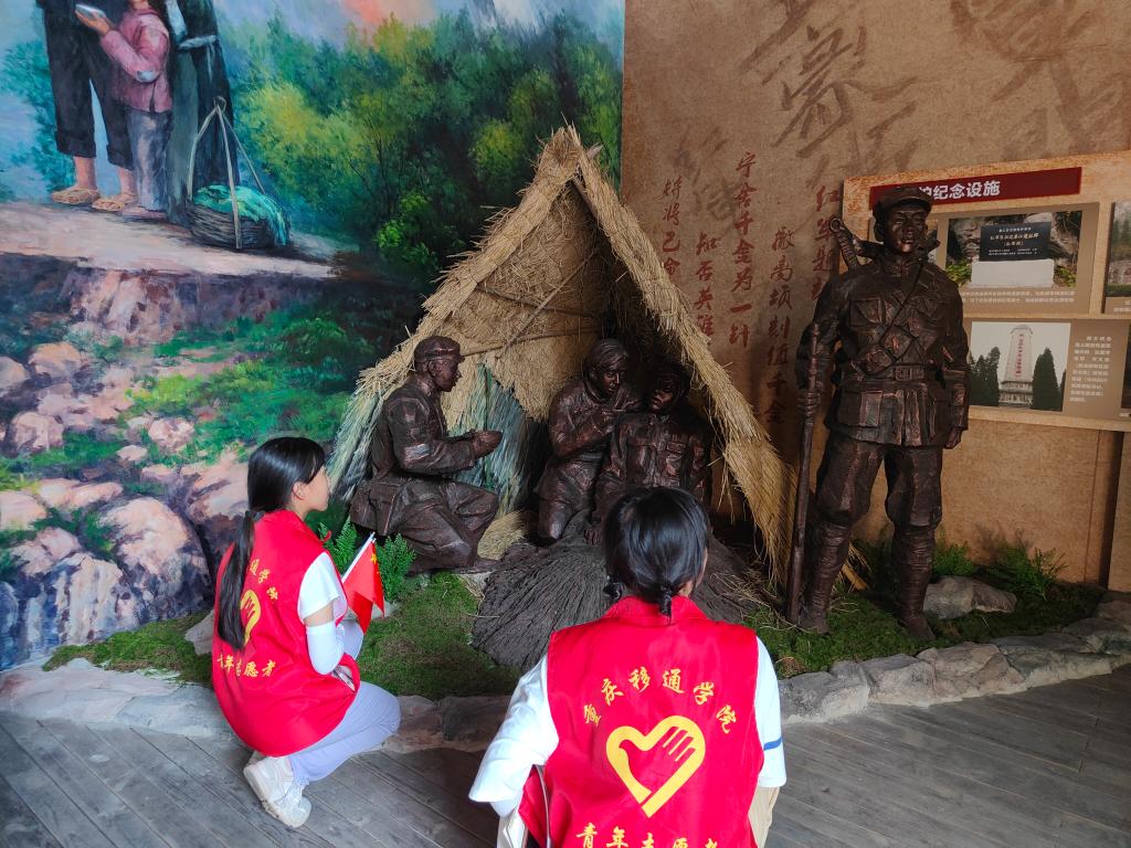 第二站:“壕壕”们怀着沉重的心情前往石壕镇红军烈士墓进行参观。长征诗碑伫立在台阶中间,烈士纪念碑高高耸立,五位红军烈士塑像巍然伫立,烈士事迹陈列室沉淀着悲壮感人的故事。在烈士雕塑前,志愿者们为牺牲的烈士默哀,并进行了入团宣誓仪式,意志坚定、满怀敬意;来到碑林处,志愿者们对碑刻进行拍摄,查阅相关资料,完善题词和题词人生平事迹,并整理成二维码,方便来到碑林之人扫码阅读。