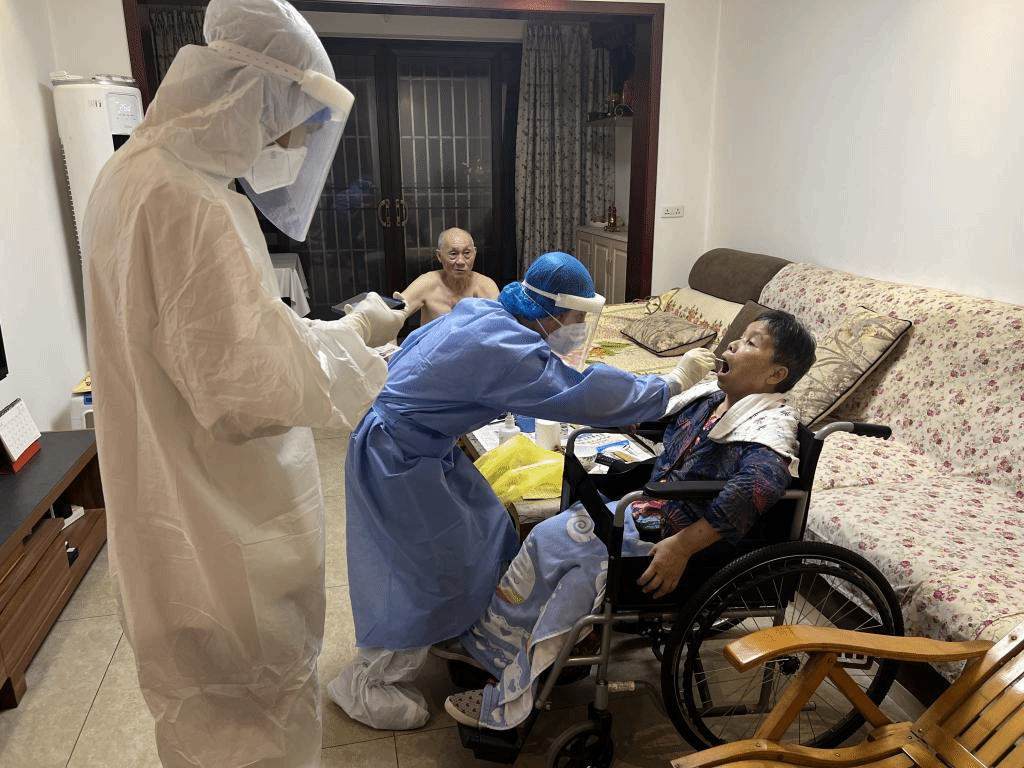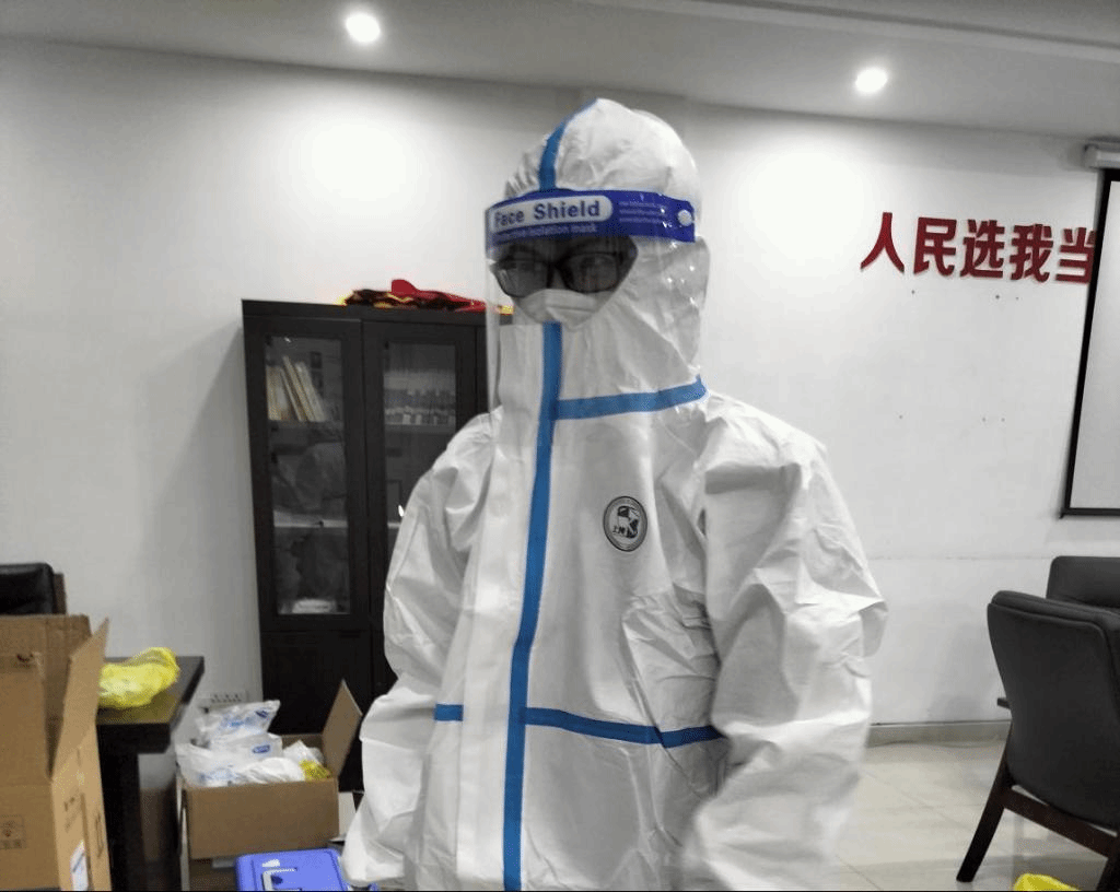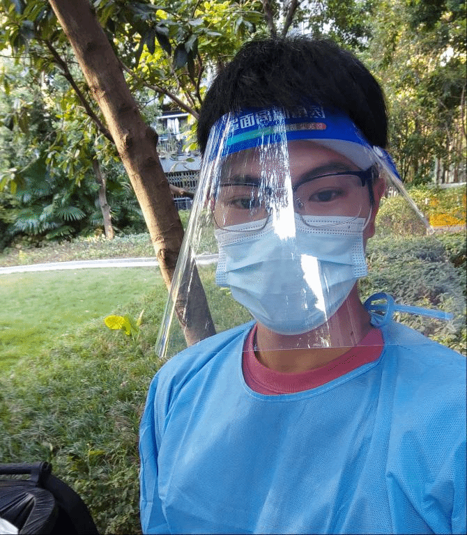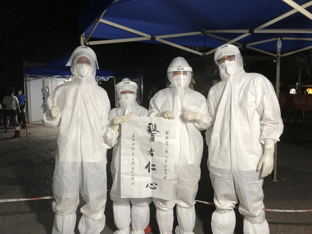 诸如上述志愿者的还有很多同学,2020级的李滨斌同学每天早上4点就需要起床,前往固定地点等待医护人员的到来,虽然能做的就是维持现场秩序,帮助不会使用健康码老人们,能做到的不多,但是能够为疫情防控作出一点贡献也是值得的。2020级的丁立同学在进行志愿工作过程中,全程穿戴防护服,在面对行动不变的老人时,和医护人员逐一进行上门核酸采集。脱下防护服看到自己全身打湿和泡白的双手,又看到居民赠送的“医者仁心”,无疑更加坚定了丁立参加志愿工作的决心。