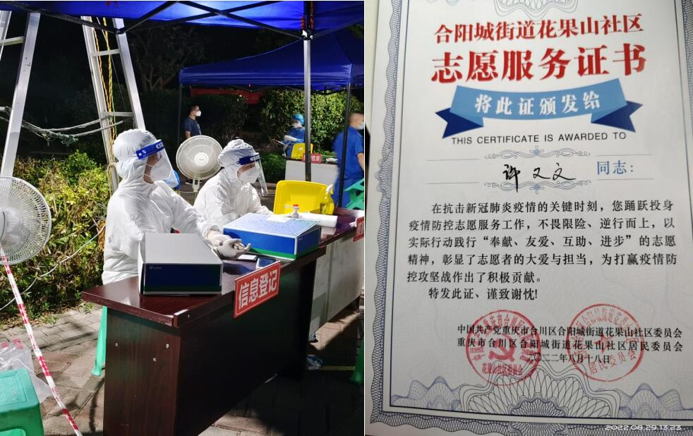 今年夏天我们不仅仅面临高温,疫情还有山火,作为在校大学生同时也是入党积极分子,自知有责任和义务为家乡贡献出一份力量,主动报名参加了社区的志愿活动。负责秩序维护和疫情信息排查,顶着40+的温度在户外工作至少5个小时以上,好几次有多名医生中暑,在这样的条件下,大部队依旧是早出晚归的坚持核酸检测,社区工作者在自己做好措施的情况下同时劳心劳力的去劝导其他人。这样的场景不禁令人动容。我相信,在所有人的努力配合下,我们共克时艰,同心抗疫,必将胜利!重庆加油!