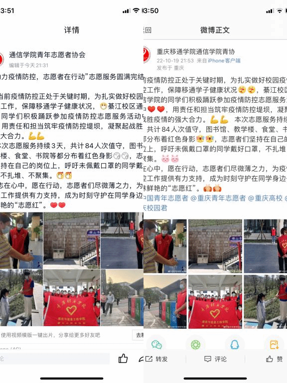 线上线下齐宣传,疫情防控不松懈。通信青协充分利用学校官方微博、QQ疫情防控点值班等“线上+线下”宣传方式,形成全校宣传矩阵,向师生宣传疫情防控常态化小知识,切实提高师生思想认识和防护能力。确保第一时间宣传教育到位、思想引导到位,突出长效化防控、常态化宣传。志愿者们利用课余时间,在做好自身防护的前提下,开展文明引导、防疫宣传、巡查监督、便民服务等志愿服务工作。
