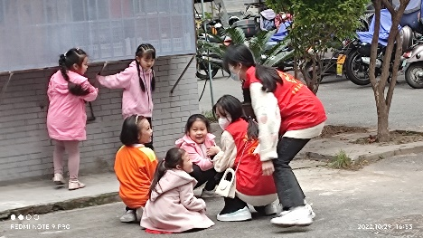 完成创作后,志愿者们有带领小朋友们进行游戏玩耍,小朋友提出了很多的游戏有“老鼠偷油”,“丢手绢”,“一二三木头人”,“羽毛球”等游戏,志愿者们也分批次的与小朋友们玩了大部分游戏,在游戏过程中出现了一些小趣事志愿者需要小朋友讲解游戏规则,与其说是志愿者陪小朋友玩耍倒不如说是小朋友陪志愿者回忆童年,我们一起玩了很多游戏,小朋友们的笑声充斥在杨柳街的上空,小朋友们天真、稚嫩的脸庞上洋溢着灿烂的笑容,他们精力旺盛,他们快乐烂漫,志愿者和小朋友陪伴了彼此难忘的一段时光,快乐的时光总是短暂的,又到了分别的时候志愿者和小朋友从最开始的不熟悉到最后依依不舍的再见,志愿者和小朋友陪伴了彼此难忘的一段时光,相互治愈和陪伴了彼此的生活,保持童心不忘做志愿者的初心。