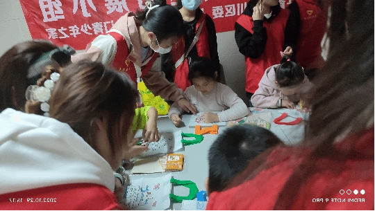 经过一段时间的等待,身披着红马甲的志愿者如约的来到了杨柳街,见到了活泼可爱的小朋友们,志愿者们将活动的材料准备好后带着小朋友们进行了自主的创作在创作的过程中小朋友和志愿者相处融洽,没有丝毫的陌生的感觉。