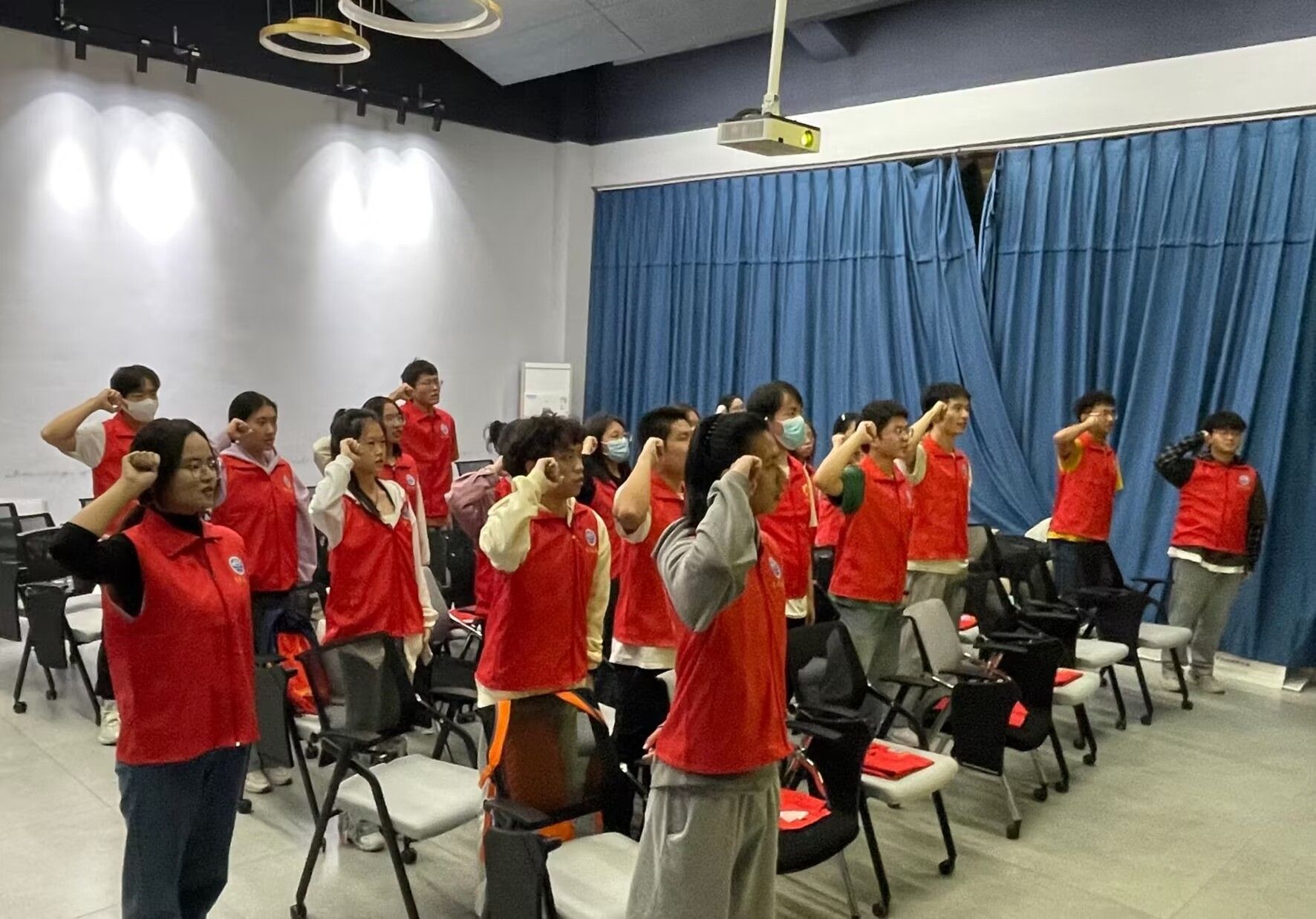 活动最后,由副支队长曾志远带领全体队员宣誓。同学们身穿红马甲,眼里满是信念与坚定,相信通过这次庄严郑重的宣誓,能让支队成员有强烈的自豪感与责任感,能更好地做好志愿者工作、更好地去帮助他人,服务社会,为建设团结互助、平等友爱的美好和谐社会做出贡献。