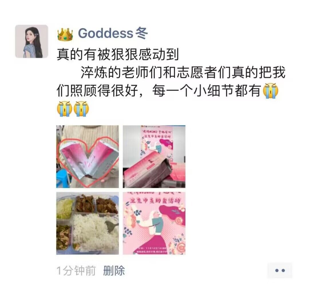 “有同学反应卫生巾紧缺”“老师,我在生理期,您能帮忙买一些卫生用品吗?”随着校园封闭管理,女性师生对于卫生用品的需求非常紧迫。淬炼·国际商学院、校团委以及学生处宿管中心的教师志愿者们在了解到该需求后第一时间作出反应,收集整理卫生巾互助盒志愿项目物资,结合学校女生宿舍分布情况和区域,制定“疫情NONO·予她安心”卫生巾互助盒行动,“急困难者之所急,帮困难者之所需”,第一时间为学校女性师生送去卫生品物资,并嘱咐她们放松心态,积极配合抗击疫情,学校全体老师将会一直与所有同学站在同一战线。