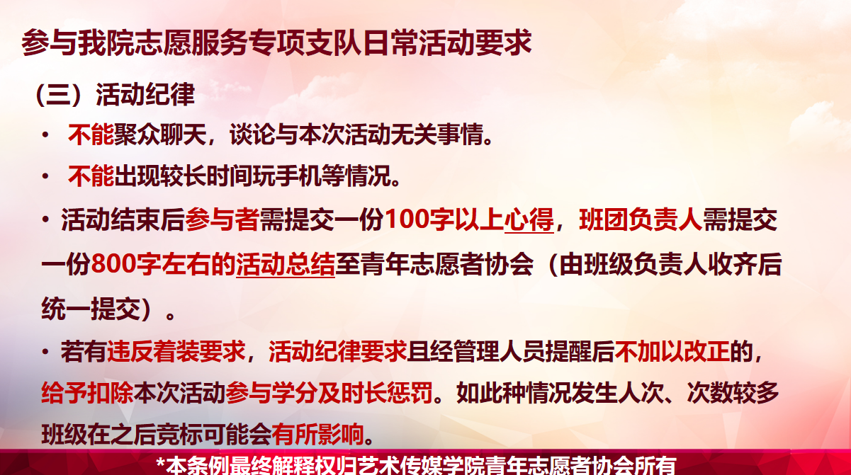 为推动志愿服务质量建设,培养更多志愿服务骨干,落实完满教育育人理念,11月16日下午,艺术传媒学院青年志愿者协会采用线上的形式开展了志愿者培训会议,由青年志愿者协会办公室莫丹丹主要针对艺术传媒学院2022级新生及专升本各班委讲解志愿服务及工作细则。
