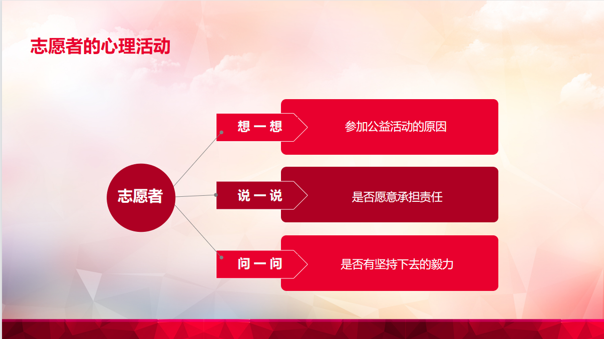 “不以善小而不为,一滴水,也能映出四海五洲。搭把手,搭上一把手,人生旅途一起走.....”只有短短几十字的“《搭把手》——献给志愿者之歌”道出志愿者无私奉献,小善渐而大德生的美好品德。期待同学们通过此次培训,热情投身在今后的志愿服务中,将“奉献,友爱,互助,进步”贯穿始终,将志愿服务扎根基层,推进精神文明建设,共建美好校园。