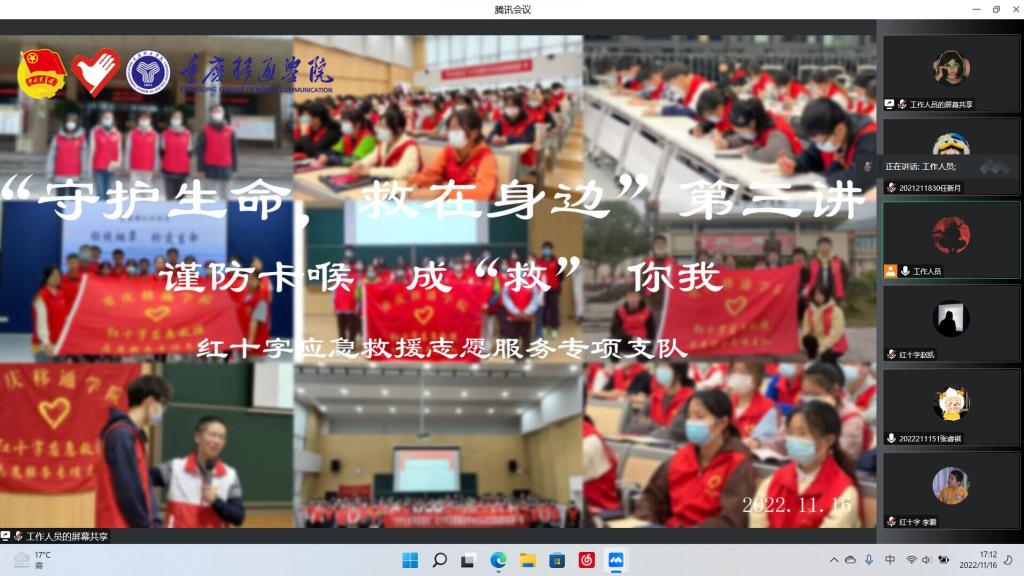 在生活平静惬意的今天,我们时常会听闻一些让人揪心的事故报道,而近些年来,因窒息引起的一系列祸难频频发生,面对突如其来的紧急情况,我们应当具备足够的知识和能力去应对它们,去保障自身与他人的生命安全,而海姆立克法,就是能让我们应对突发的卡喉事件,使受难者在短时间内得到有效的救助。为了让更多的人了解并学习海姆利克法,红十字应急救援志愿服务专项支队在遵守疫情防控的同时,于2022年11月16日下午16:00通过线上公开课的方式开展“守护生命,救在身边”第三讲——海姆利克法专题活动。其中线上参与人数150人!