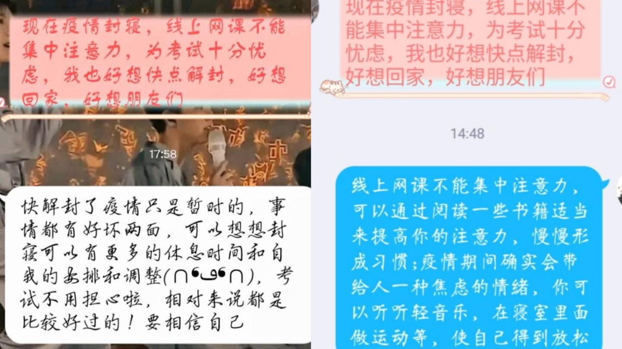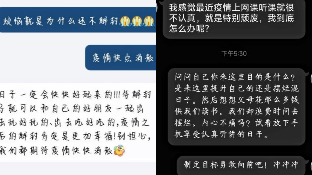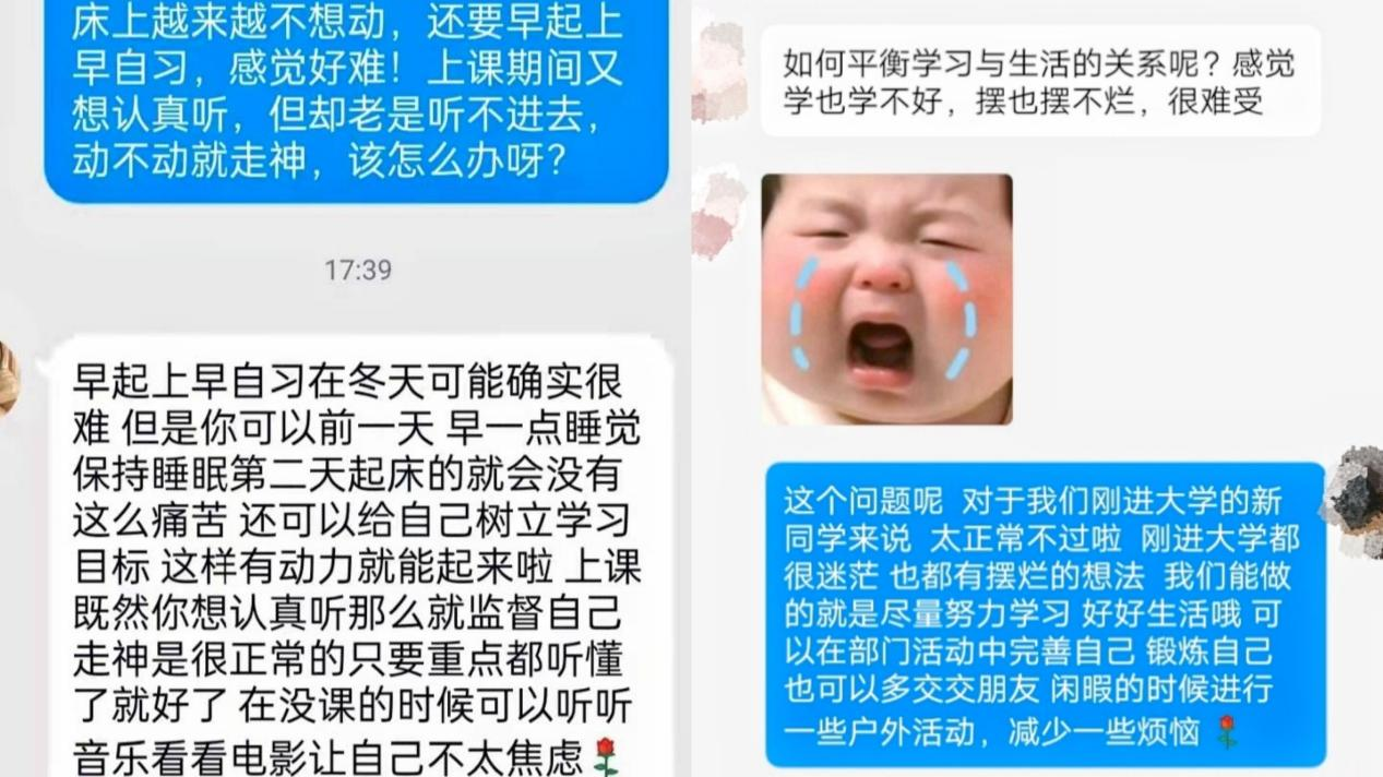 活动中期同学们积极参与本次活动,主动填写表格、添加对方好友。以爱心短信接力的方式分享双方的喜怒哀乐,前者分享自身所遇到的烦恼与不愉快,后者为前者提供有效的应对措施并加以鼓励。在此期间,同学们以陌生人的角度积极分享封寝时所遇到不愉快和烦恼的事情,并鼓励治愈对方的心灵,提交了众多优秀的作品。在疫情期间同学们有很多的烦恼,比如封寝后上网课很难集中注意力,担心自己的学习状态会影响接下来的考试;在学习和生活中无法平衡两者之间的关系等多种情绪;通过线上的方式同学们以网友的身份倾听双方,为彼此提供缓解情绪的方法。