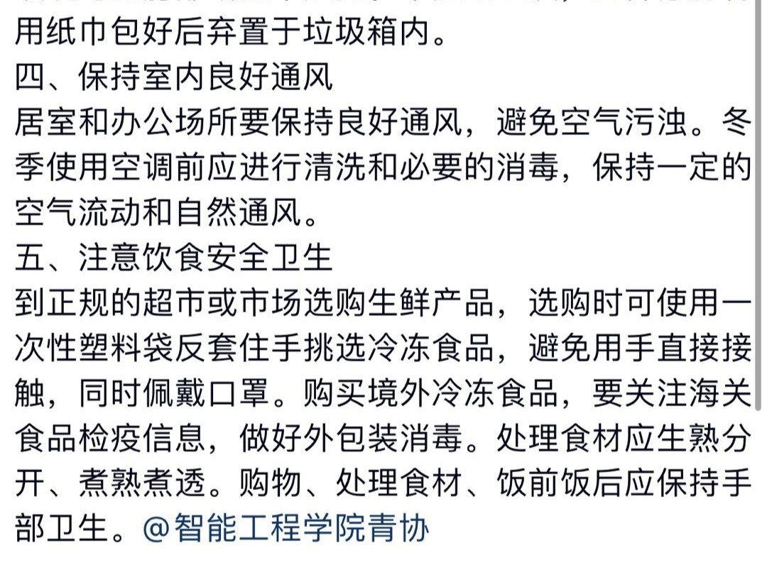 疫情期间需要同学们做好以下12点:勤洗手,戴好口罩,注意咳嗽礼仪,少聚集,文明用餐,遵守1米线,常通风,做好清洁消毒,保持厕所卫生,养成健康生活方式,核酸检测,疫苗接种。每位同学做好以上12点,既保护自己,也保护了身边的室友,更是为疫情防控工作做出来贡献。