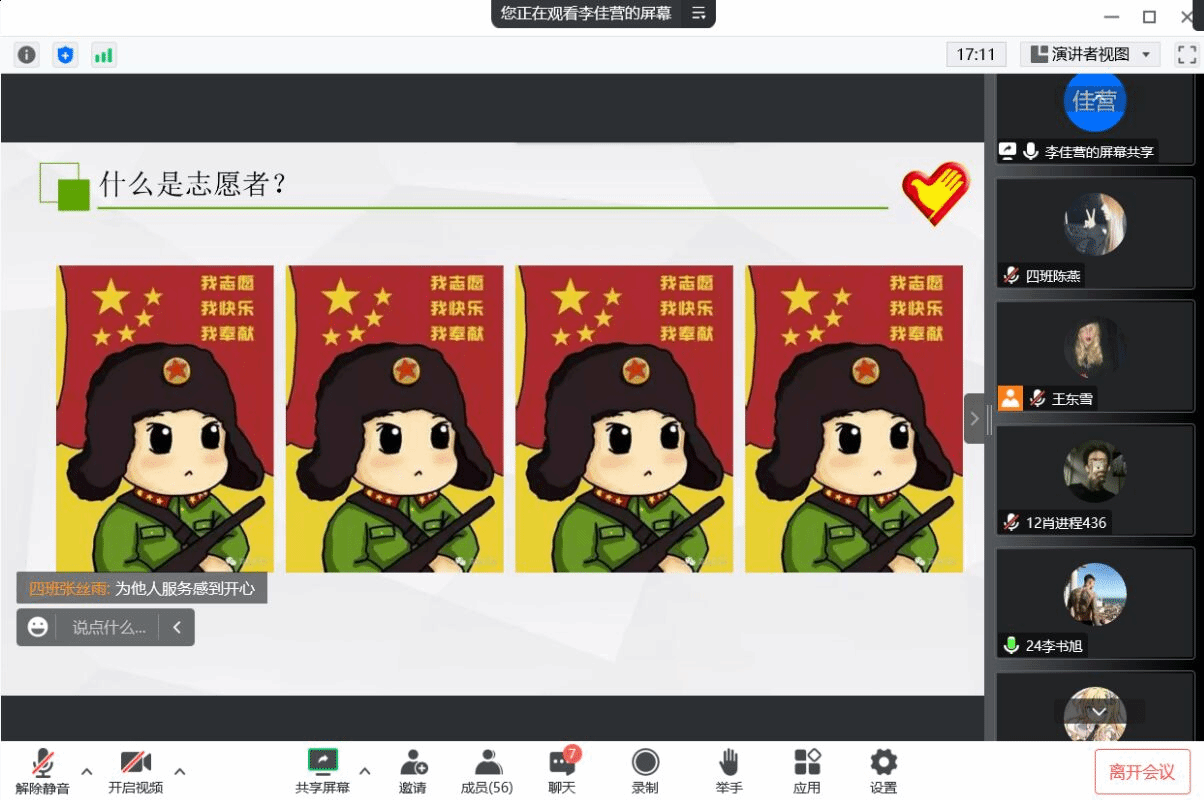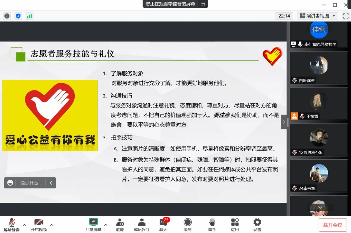 为了提升学校青年志愿者的思想素质,提高办事效率,提升志愿服务质量。“伐木累”通信学院志愿者培训志愿服务专项支队于2022年11月21日在线上开展“志愿一份心、公益更精彩——花果培训”基础班培训活动,2022级通信与信息工程学院各班级派出两位代表参加此次培训。