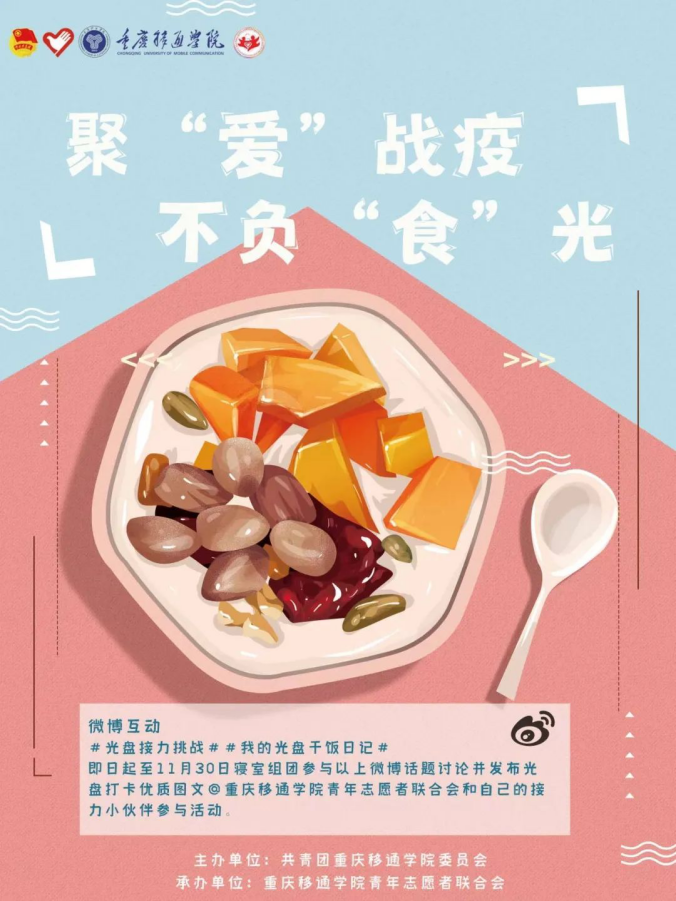 天地“粮”心,珍食莫蚀。“民以食为天”,在疫情防控下,我们更应该珍惜粮食。为此,青年志愿者联合会组织开展了光盘行动。以连续一周在微博上晒出自己光盘前和光盘后图片的形式开展活动。一周的光盘打卡活动,让同学们更理解了“节约”并非嘴上功夫,更是行动。同学们也晒出节约,杜绝浪费,晒出态度,不负“食”光。米粒虽小,尤见礼义廉耻,米粒都来之不易,每一次光盘都刻不容缓。
