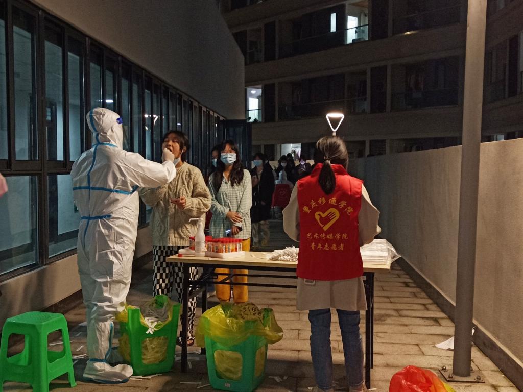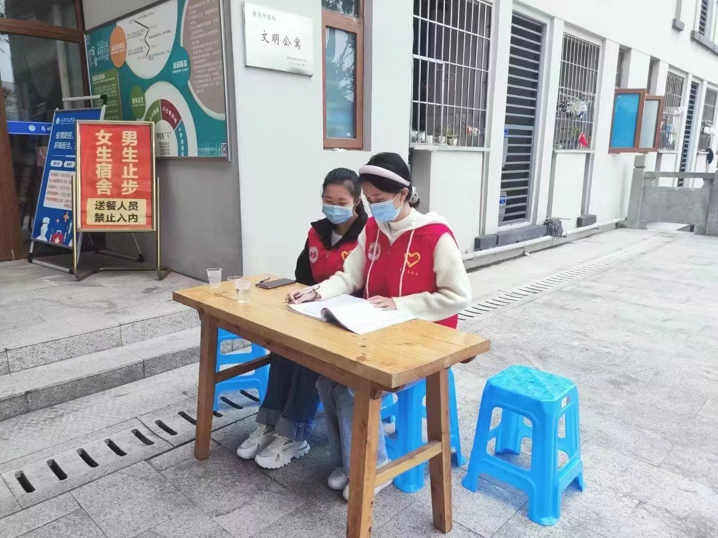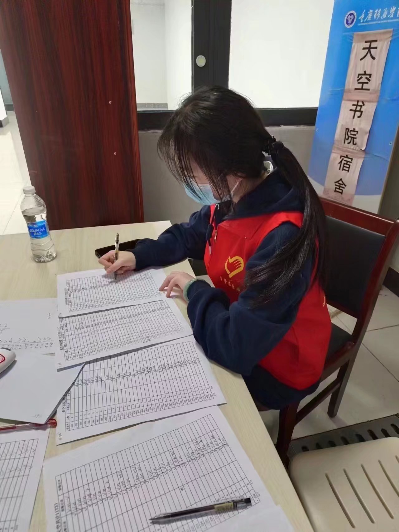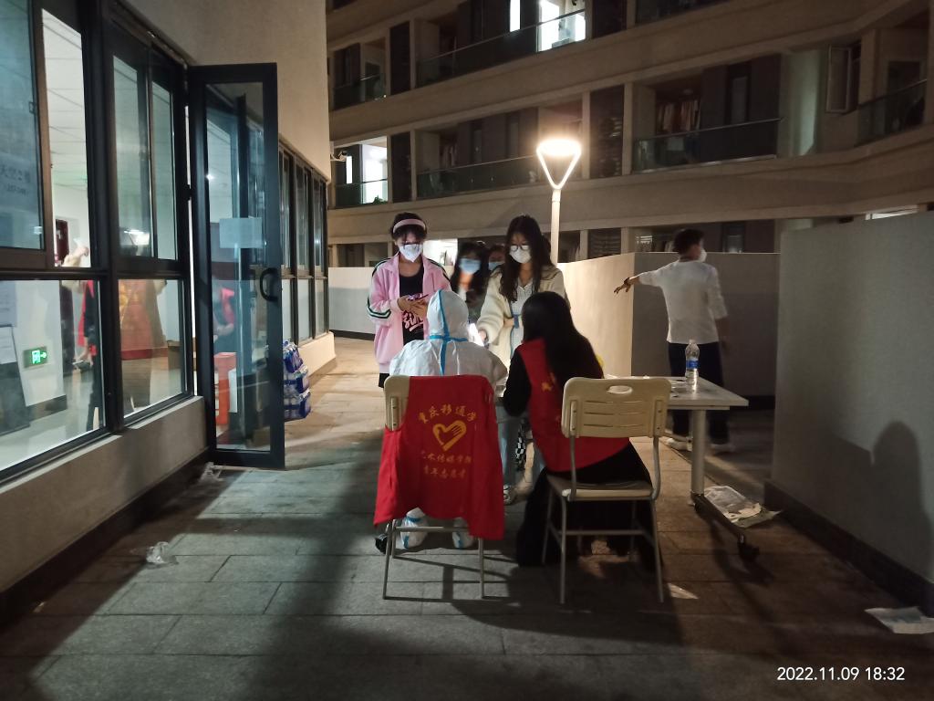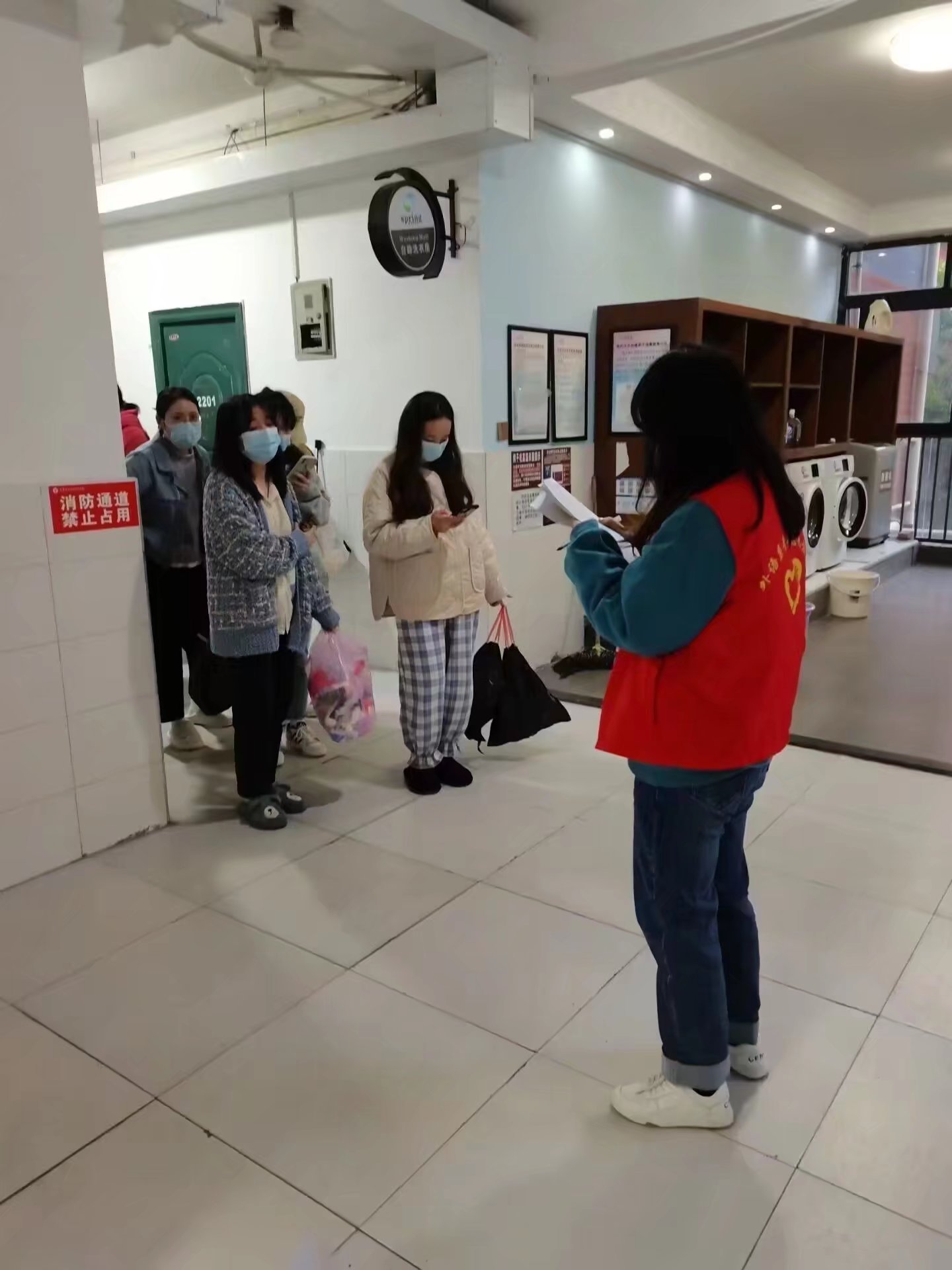 在每一栋宿舍楼里,有这样一群学生志愿者,他们自发请愿,坚守防疫后勤。到饭点与购物时间,她们站在宿舍楼下,做好人员流动登记,严守每一个出入口;核酸时间,他们分别站岗,拿起小喇叭喊“一楼的同学准备做核酸了,大家穿好衣服,戴上口罩,拿好垃圾”。温馨的提示从每一层楼到每一个宿舍,并站在楼梯口,引导核酸检测秩序,确保宿舍与宿舍之间保持间隔。当他们站在宿舍楼栋里时,喇叭、体温枪、登记表成了他们手中的武器,他们默默守护着同学们,让同学们更加安心生活。