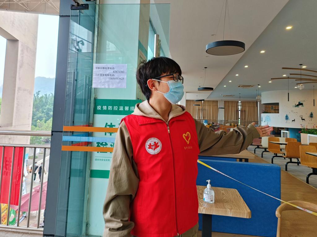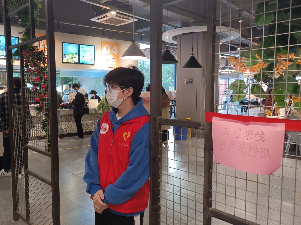 走近食堂,一个个青春活力的“志愿红”映入我们的视线。他们团结协作,分工明确,贴心地提醒每一位进出食堂的同学佩戴口罩,悉心引导排队候餐的同学们保持一米间距,有序排队。他们坚守岗位数小时,不为空气中时而飘来的饭香所动,积极配合保安大叔和食堂工作人员,耐心地为同学们解答疑惑,认真地履行自己的工作职责,成为了学生食堂里一抹靓丽的红色风景线。