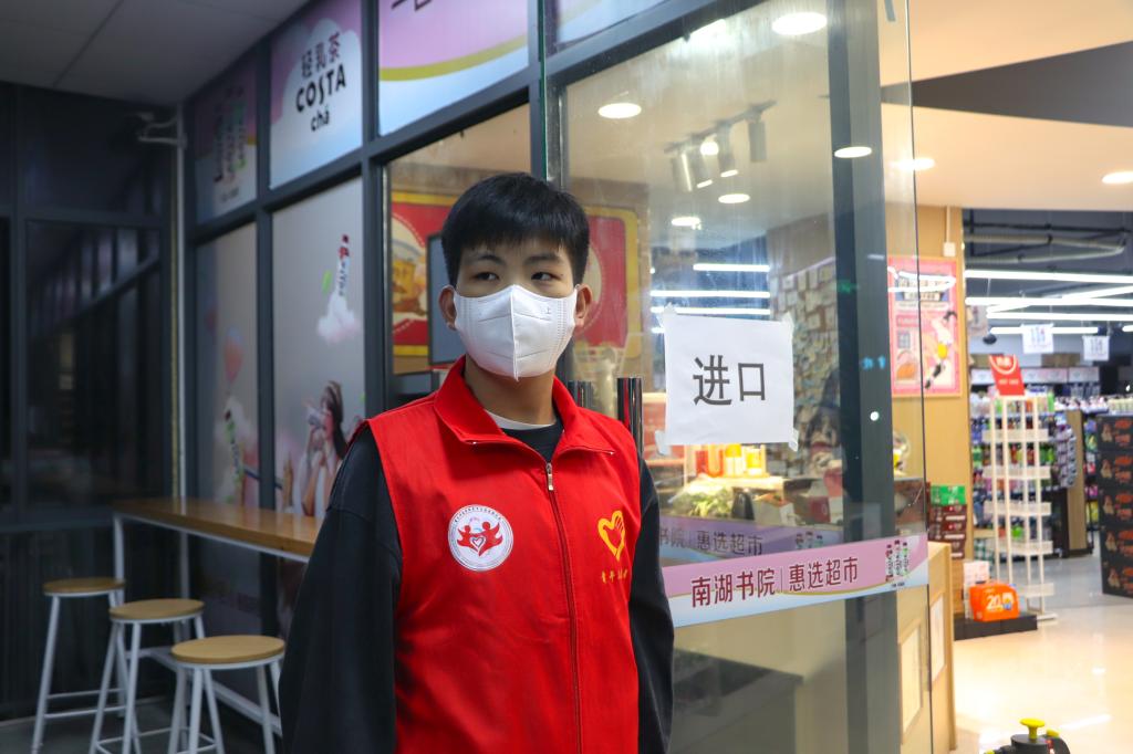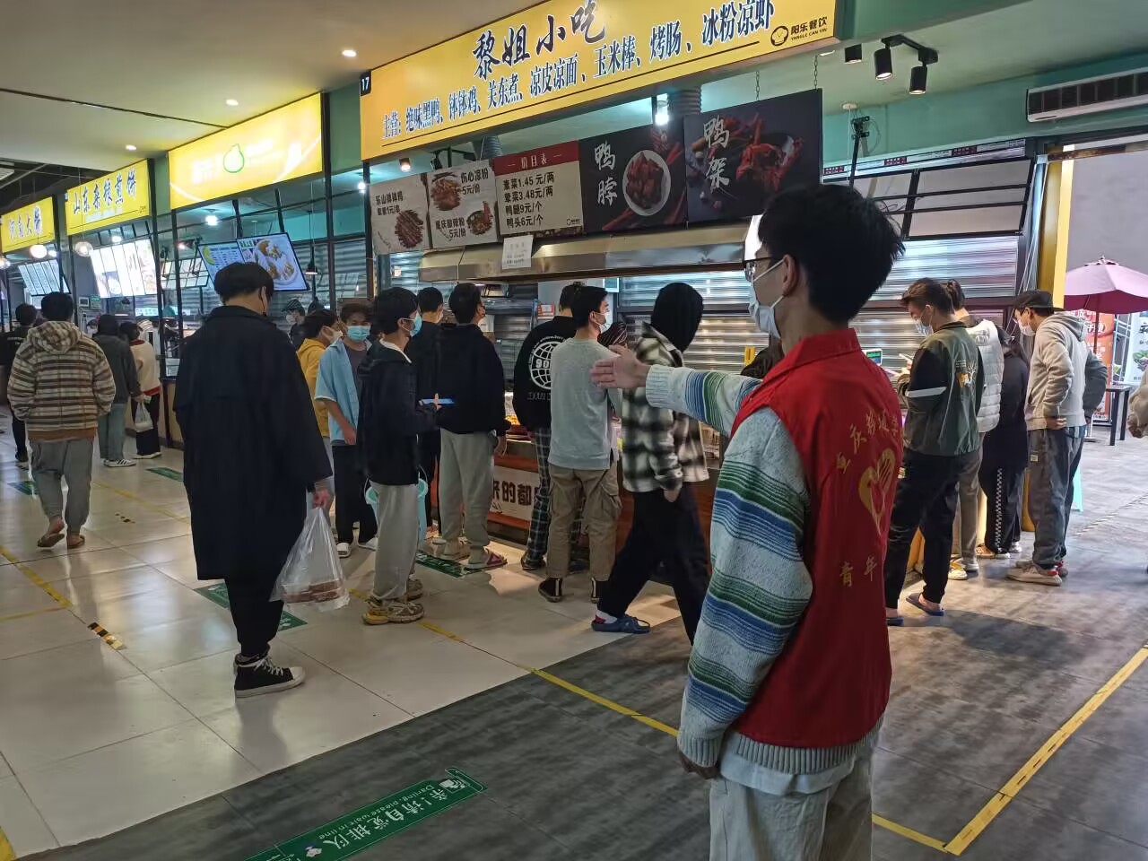 志愿者们在入口处温馨地提醒同学们戴好口罩,有序引导等候结账的同学们保持一米距离。同时将进入超市购物的同学限流,安抚着同学们焦躁的情绪,有条不紊的让同学们进行物资购买。既提高了购买效率,又降低了感染风险。