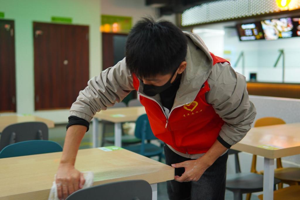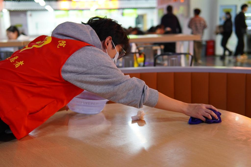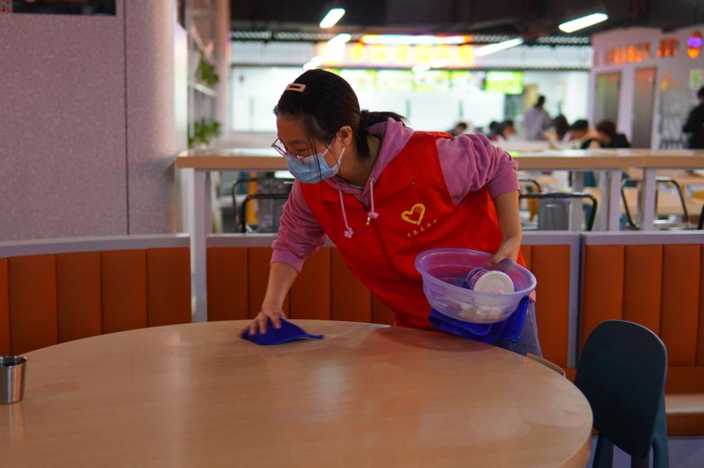 美好的时刻总是稍纵即逝,感恩的瞬间总是令人流连。每一次擦干净的餐桌,每一次摆放好的桌椅,即使在别人看来是微不足道的举动,但青年志愿者们身着红马甲穿梭于食堂楼层,置身于食堂阿姨每天辛勤劳作的场域,不仅带给食堂阿姨们欢声笑语,也切实增强了我校职工的幸福感、归属感,更增加了志愿者们的职业认同感,使“奉献、友爱、互助、进步”的志愿精神得到传递与展现。