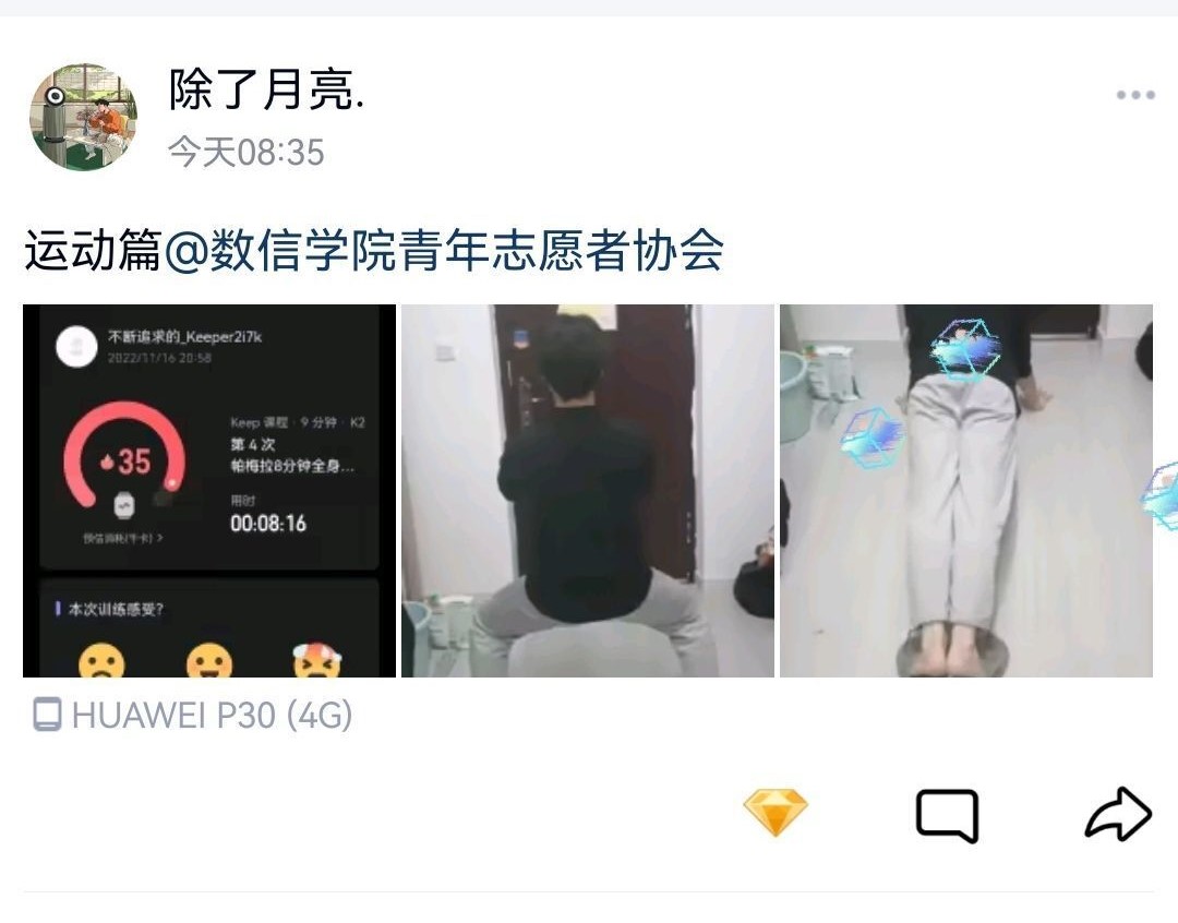 运动健康打卡篇。通过拍摄健美操、健身等各种运动内容记录。“体育者,人类自其养生之道也,使身体平均发达,而有规则次序之可言者也。”毛泽东将体育列为“三好”之最,足以体现运动的重要性。今天的不出门是为明天的车水马龙。居寝生活下,同学们也不该放弃运动。运动锻炼可强身健体,可修身养性。