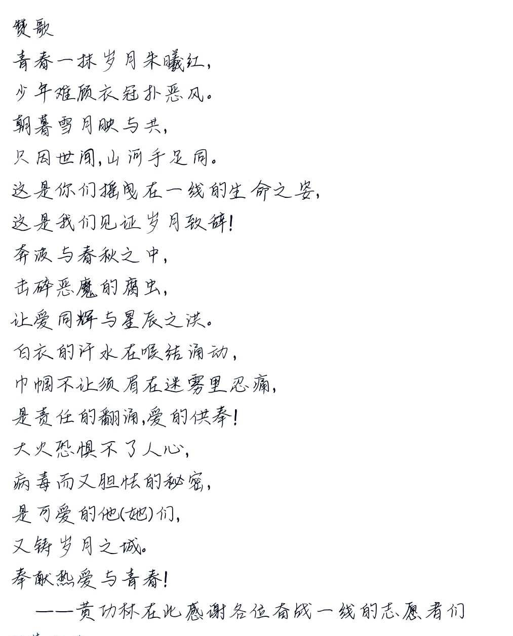 愿历此坎坷,山河可无恙,人间皆平安!每位同学的热情付出都是为了感激那些在疫情中默默付出的抗疫工作人员们,感谢他们的付出才换的我们如此安宁的生活,感谢他们的付出让我们的在疫情之后重逢,感谢他们义无反顾的冲上前线,为我们的国人守下防疫的大门!愿疫情过后,人长久。海有舟可渡,山有路可行。愿余下的岁月,无灾无难!愿所有防疫人员带上我们所有同学的美好祝愿,在世界的各个地方健康美满的生活!