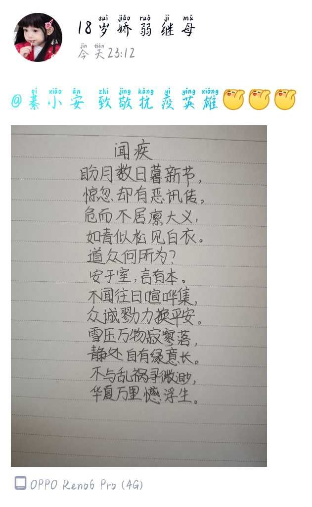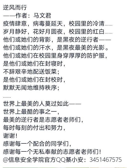 “疫情无情,人间友爱。”信息安全学院青年志愿者协会通过线上收取各位同学们写的温暖的短诗,通过对写一首首的短诗来表达对疫情疫情期间各位抗疫志愿者的感激之情。各位同学纷纷参与其中,一份份简短的小诗是我们对辛勤付出的防疫人员的感谢!