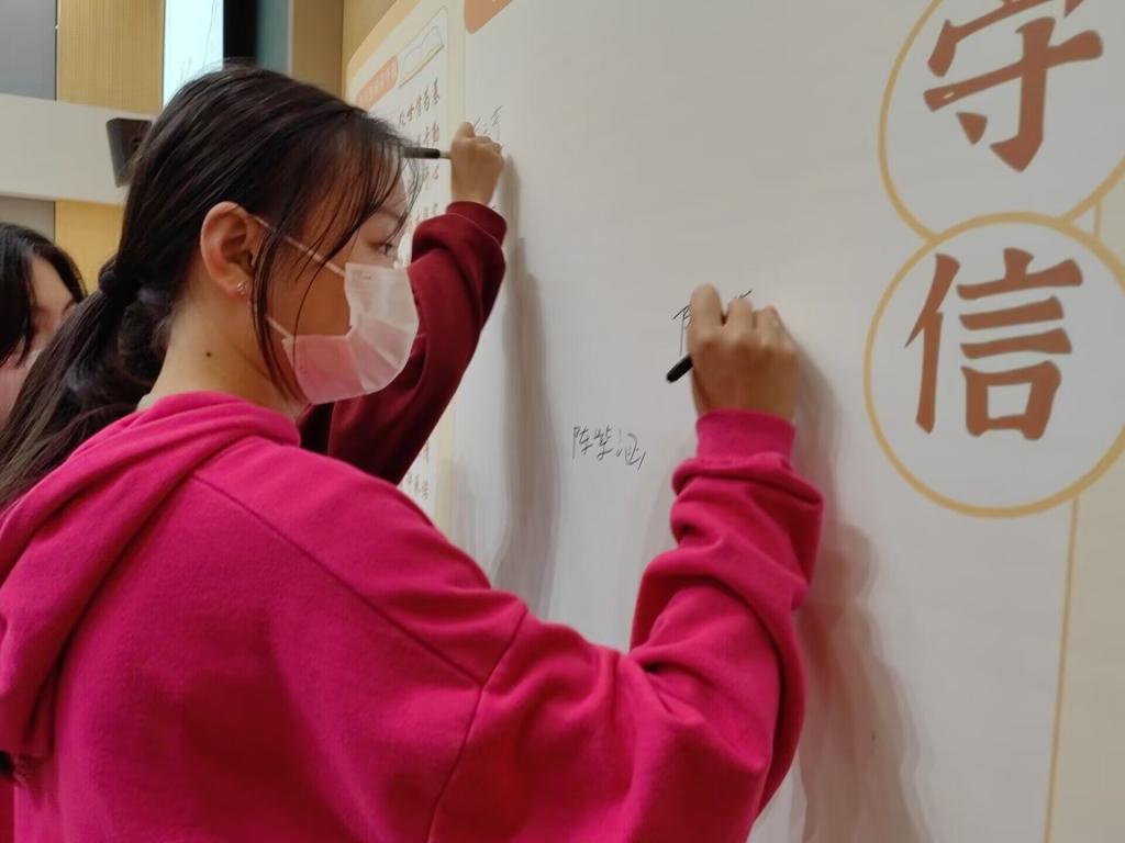 正所谓,“君子养心,莫善于城”。在这样物欲横流的世界,我们作为新一代青年,必须坚守诚信阵地,宣传诚信意识,守住信誉。诚信宣讲会至此已是尾声,同学们在志愿者的带领下进行诚信宣誓,有序地在签名版上留下自己的印章,成为诚信的建设者、弘扬者、传播者,最后进行留影合照。