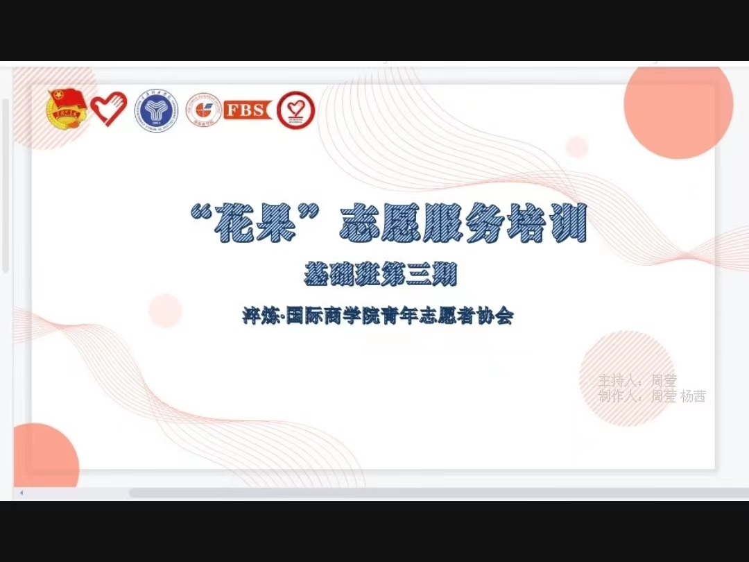 为进一步强化对志愿服务的认识,走好志愿服务之路,淬炼·国际商学院青年志愿者协会于2022年11月25日12:00线上开展了花果培训基础班第三期活动。本次培训特邀淬炼·国际商学院青年志愿者协会二届一任部长李雨航学姐分享志愿服务活动的故事与经验。