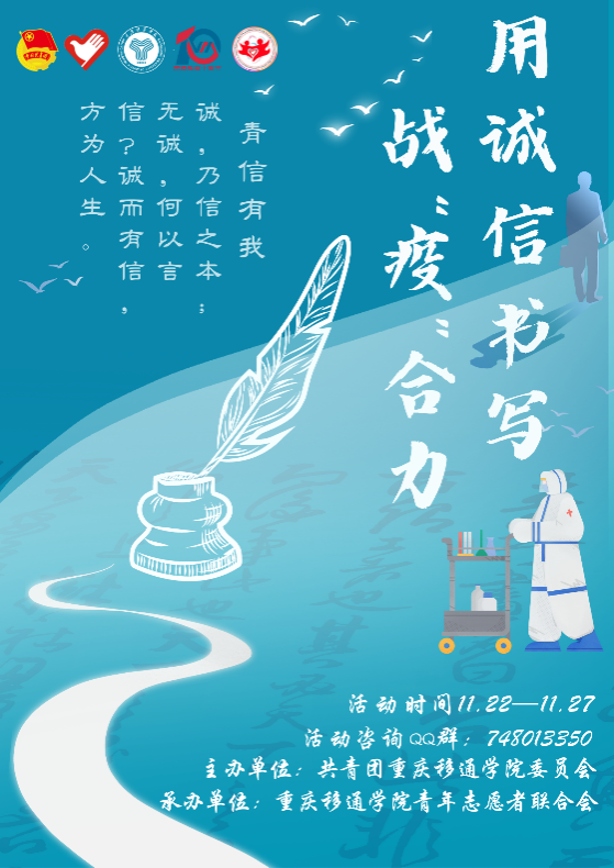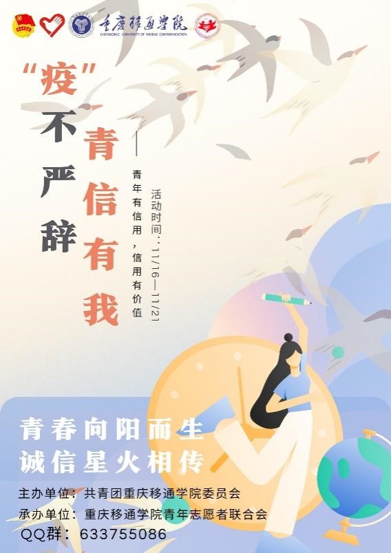 疫情防控,诚信立身,结合我校完满教育育人模式,促进青年信用体系建设发展,让更多的移通学子化成青信力量,营造青信有我,我有青信的诚信精神氛围。自觉配合、明辨是非,积极传播诚信理念,弘扬诚信精神,自觉抵御各种失信行为。在青年信用体系建设的道路上,移通学子从未缺席。