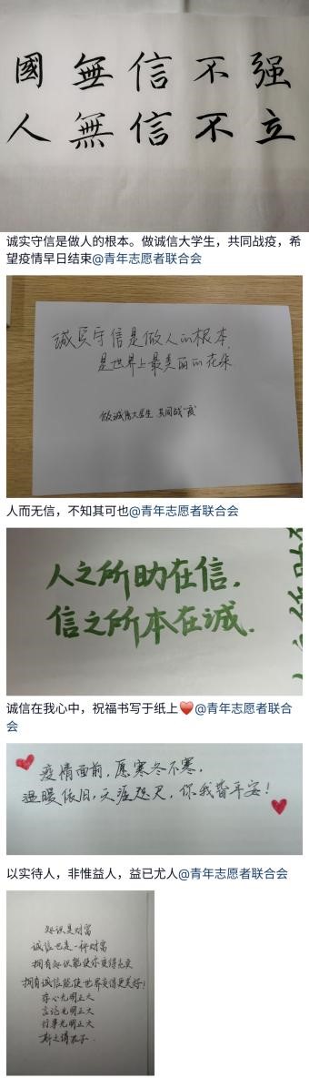 青年信用体系建设是社会信用体系建设的重要组成部分,诚信是每个人身上最珍贵的宝藏,它不仅是一种品行,更是一种责任;不仅是一种道义,更是一种准则;不仅是一种声誉,更是一种高尚品质的体现。为进一步加强青年信用体系建设,强化青年诚信意识,在校团委指导下,青年志愿者联合会于11月16日——27日采用“互联网+”的形式开展“青春向阳而生·诚信星火相传”青年信用体系建设主题系列活动,活动共吸引868余名学子参与其中。