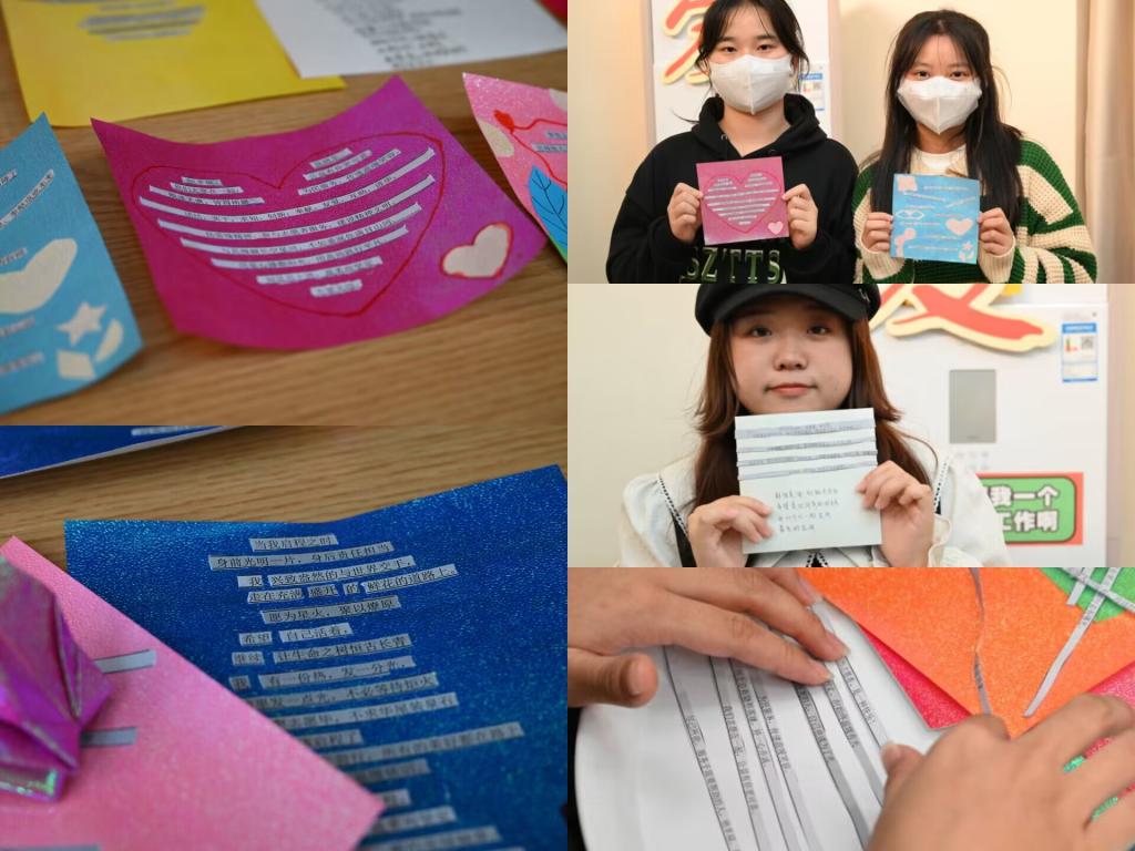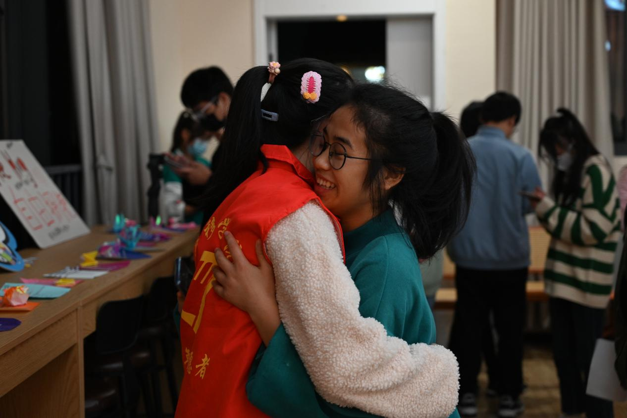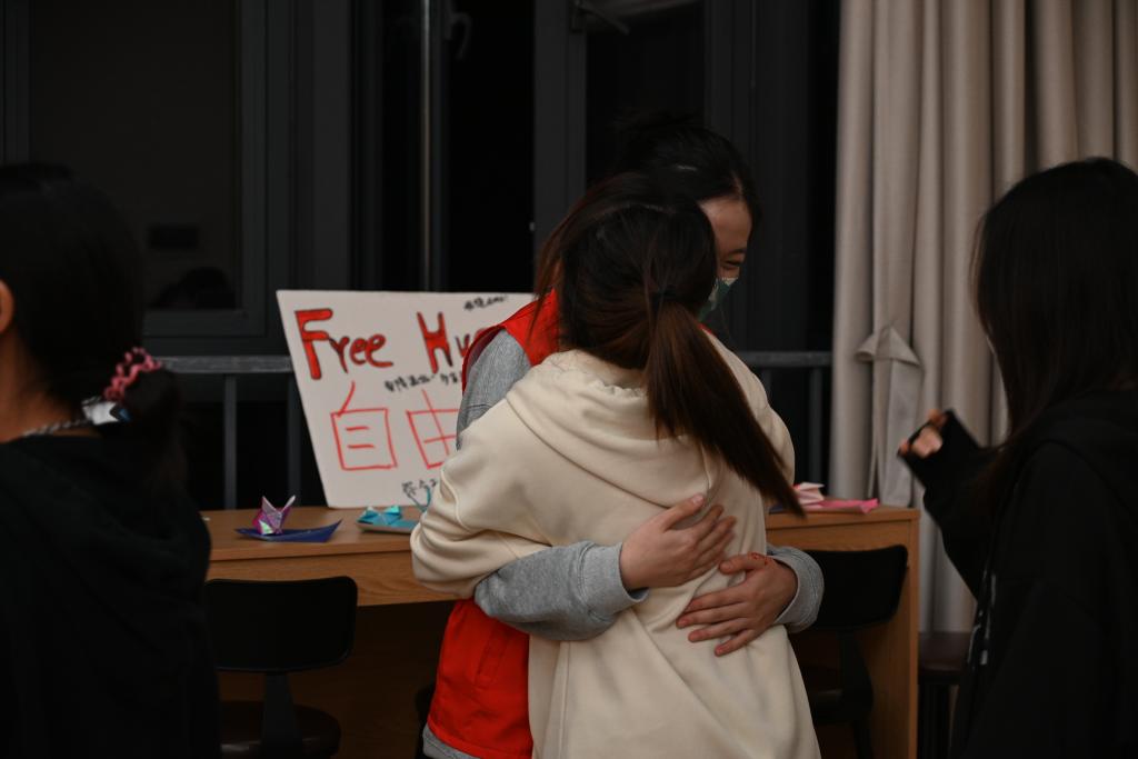 小雪已至,寒冷时光里,总有深情的人予以我们温暖的怀抱。在这个寒冷的冬日我们以自由式拥抱为主题举办了这个温馨的活动。受于疫情的限制,大家的活动范围也缩小了许多,导致有的同学会想家人,想朋友,甚至因为临近期末而使自身情绪压抑。但是这次活动以自由拥抱的形式让很多不敢表达情绪的同学从她们内心的不同角度感受到了来自朋友或者是家人的怀抱,这是思念的“收藏室”。这个寒冬处处是温暖,我们每一个人都不是孤独的单体。