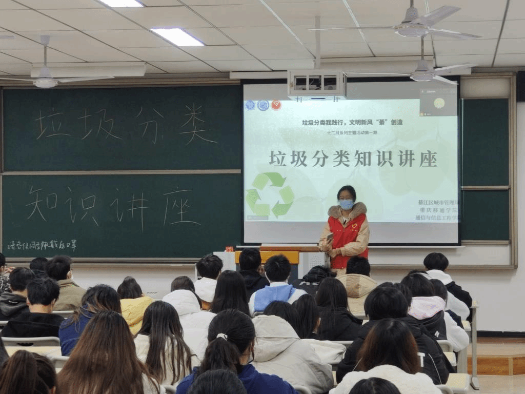 为进一步贯彻“垃圾分类”理念,推进我校双院文明建设,营造垃圾分类的良好氛围,2022年12月2日下午,重庆移通学院通信与信息工程学院青年志愿者协会联合綦江生态环境局、綦江城市管理局在仁者楼305、306联合开展了“垃圾分类我践行”文明新风“綦”创造之垃圾分类知识宣讲活动。