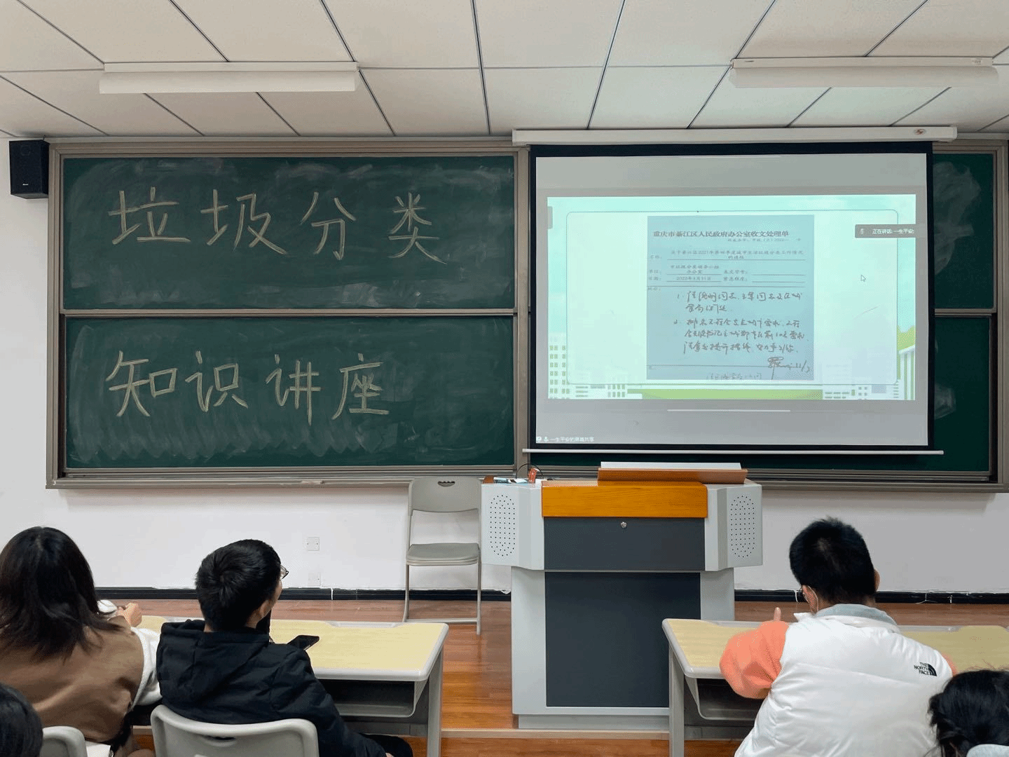 活动的最后,景科长又为同学们展示了綦江区对于垃圾分类方面的工作,有綦江区人民政府关于生活垃圾分类工作情况的通报以及在近几年来綦江区在垃圾分类方面的一些成就。景科长谈到,对于我们的社会来说垃圾分类刻不容缓,各种垃圾层出不穷,因此急需提高人民对于垃圾分类的意识,使垃圾分类理念走进千万家。景科长呼吁大家,重视垃圾分类,将垃圾分类贯彻到生活中,才能使地球的空气更加清新,环境更加美丽。同学们也积极响应,纷纷表示从今开始正确的进行垃圾分类。