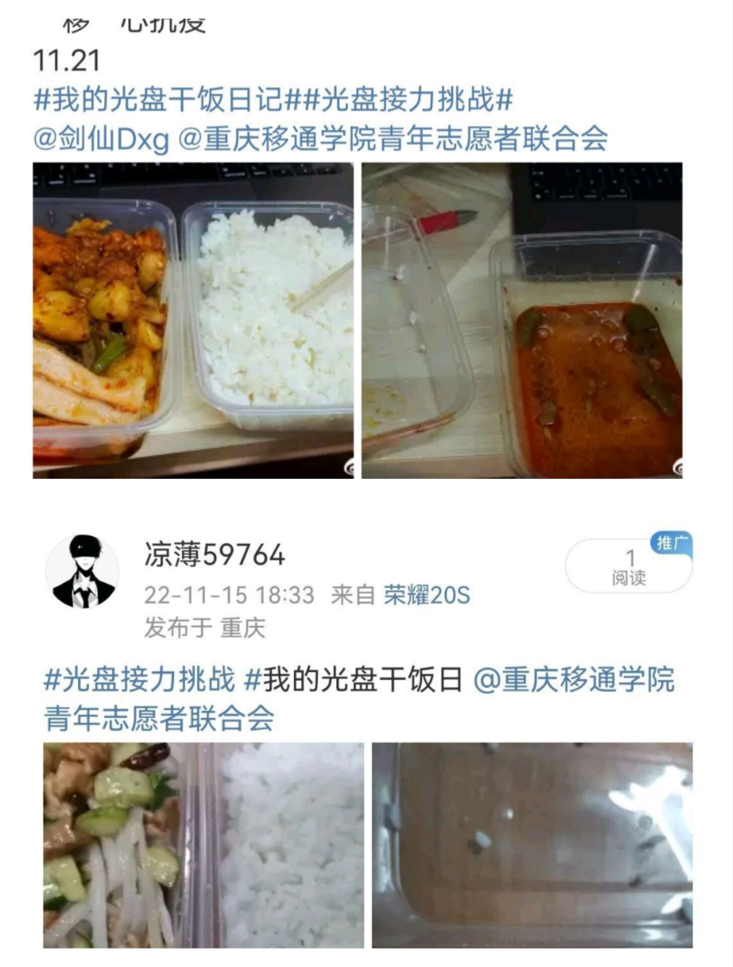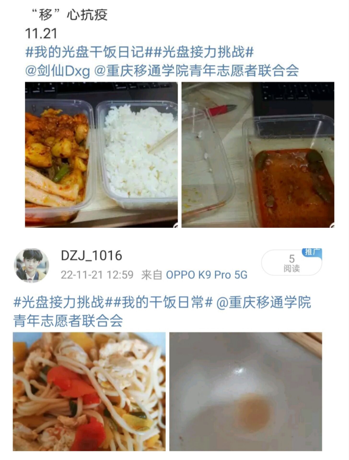 “一粥一饭,当思来之不易;半丝半缕,恒念物力维艰。近日,为大力弘扬中华民族勤俭节约的优良传统,宣传节约光荣、浪费可耻的思想,“聚爱战“疫”,不负“食光”宿舍组团光盘打卡活动”面向移通学院全体学子开展。活动一经发起就受到了同学们的热情响应。据统计,共有3621名同学参与此次活动,8400余份“光盘”作品被同学们发表在腾讯空间、微博上,每一份作品都流露出了同学们对于节约粮食的支持,正所谓“聚点滴之俭,添光盘之彩”,新时代青年正在用自己的方式来传递正能量。