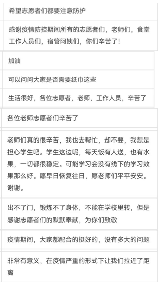 为维护良好校园秩序,缓解同学们内心的焦虑、烦躁,“心声传音机”活动为同学们提供了一个安放不良情绪的平台。通过问卷调查的方式共有487余人次参与,收到有效反馈412余份,其中152份问卷表达了对学校管理方式的肯定和志愿者们的感谢,127份问卷表达了对解封之后要做的计划,31份表达了同学们对日常学习比较难和生活用品保障方面的吐槽,102份问卷对封寝后心情上焦虑的困扰。同学们难过的、开心的、感激的、吐槽的所有心声都汇聚于此,“心声传音机”让同学们的内心得到释放,让学校更好的了解大家的心理情况,使同学们能够安心地学习生活。