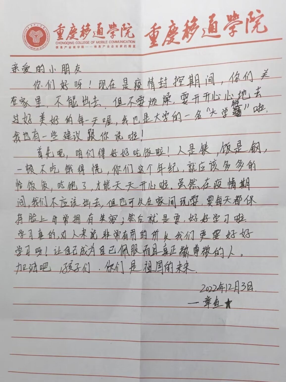 为促进儿童身心健康发展,缓解小朋友们在疫情期间的不良情绪,淬炼·国际商学院青年志愿者协会“七彩筑梦·完满绽放”关爱儿童志愿服务专项支队展开了以“亲爱的小朋友!我想对你说”为主题的线上作品收集活动。让在校大学生们通过手写信、手抄报、简笔画、明信片以及视频的形式向小朋友传播积极的正能量和满满的爱,正确引导小朋友们健康成长,传递温暖。
