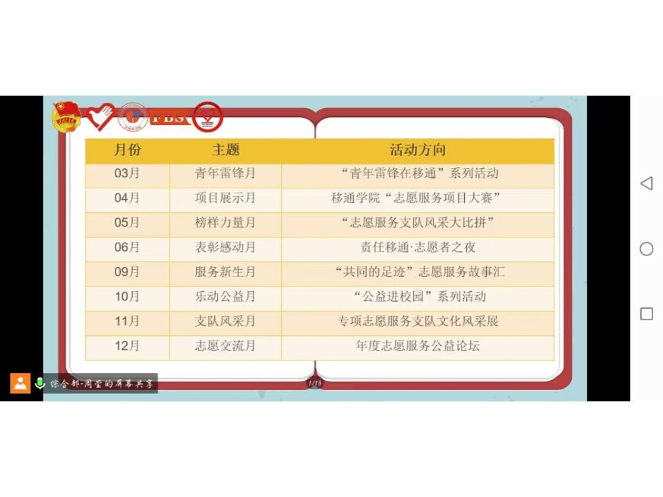 接着,综合部部长周莹向各位志愿者介绍讲解了“4条主线”相关内容,其中包括市民学校、暖心工程、移通学子在行动、三下乡活动。具体内容为市民学校包括两个“1+1建设思路”、内容设计方面为“一个市民学校一个品牌”、队伍建设方面为“一支专项一支体验队伍”;暖心工程以合川、綦江双地为主要目标,为特殊人群定向帮扶;移通学子在行动,围绕“一月一主题”的思路,开展相关活动促进学校志愿服务氛围;三下乡活动,主张以院系、学生组织、社团、班级为单位招募参与团队,进行相关志愿服务活动。
