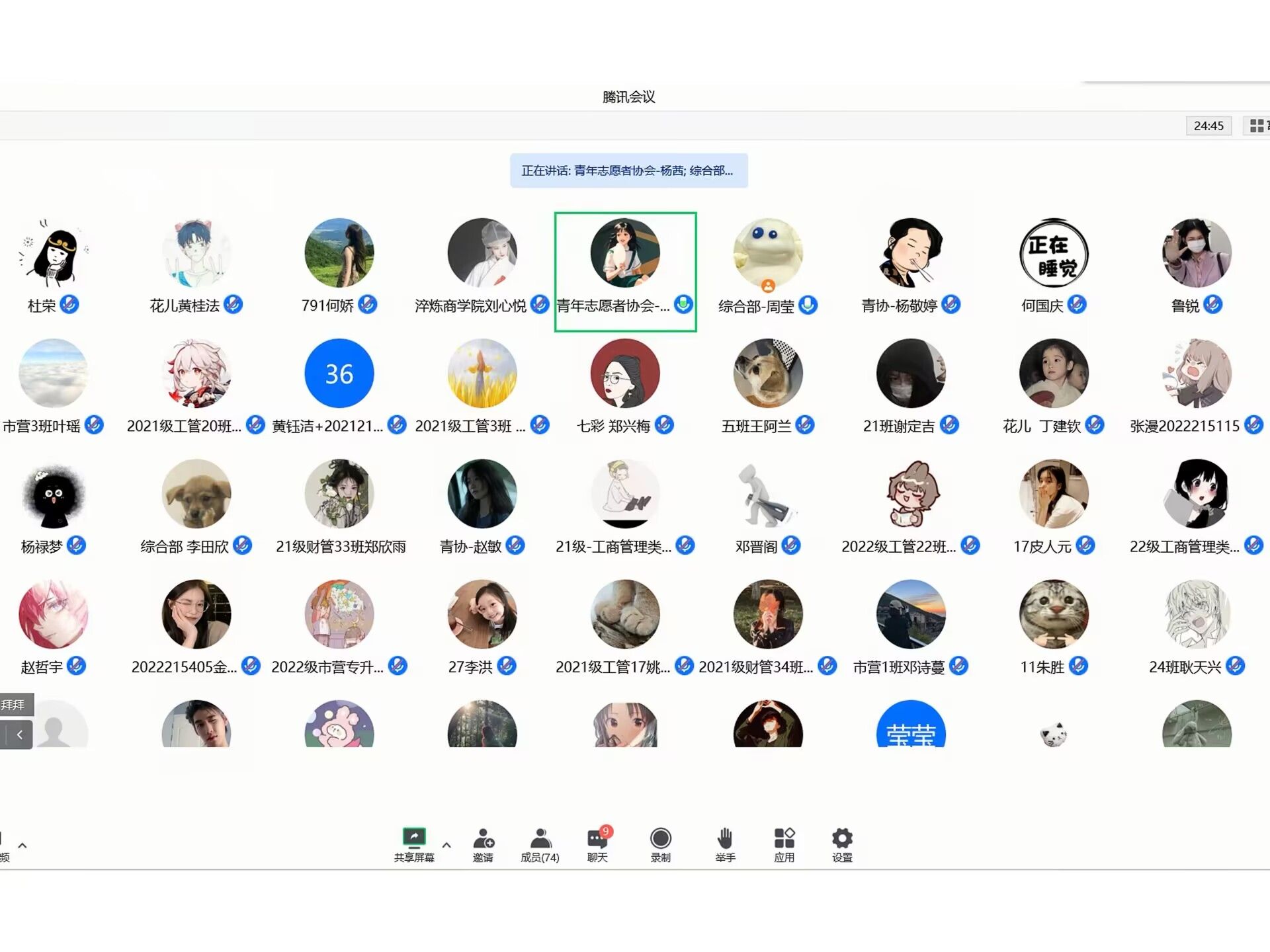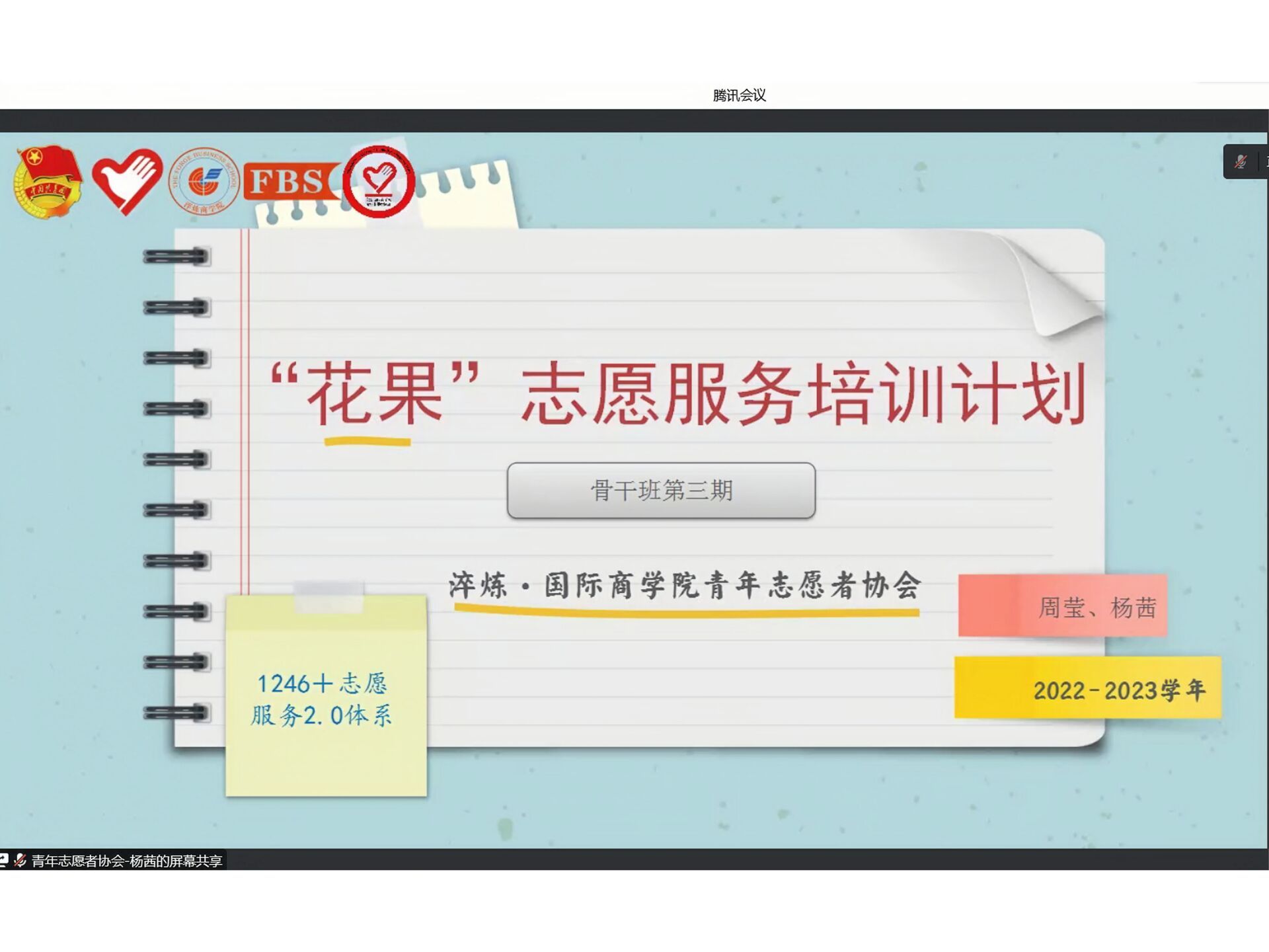 为了对未来志愿服务活动的开展奠定基础,加深淬炼·国际商学院青年志愿者协会二任二届干事、各志愿服务专项支队长以及班团负责人对我校志愿服务的理解,淬炼·国际商学院青年志愿者协会特以1246+志愿服务2.0体系为方向于线上会议的方式开展了花果培训计划骨干班第三期的活动。